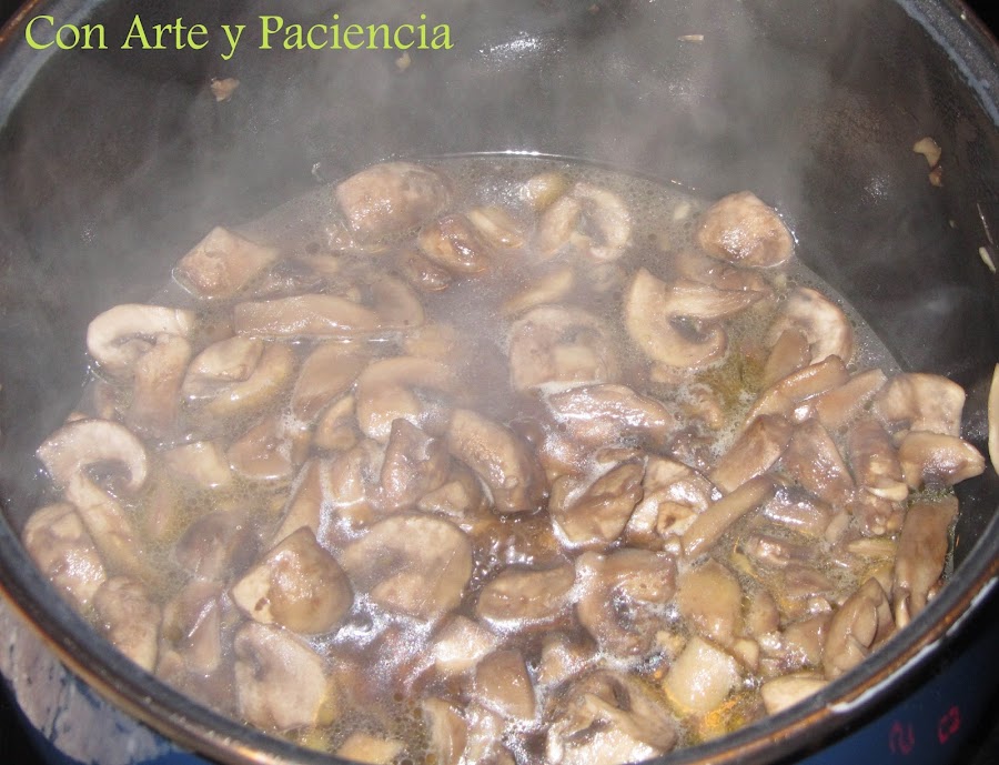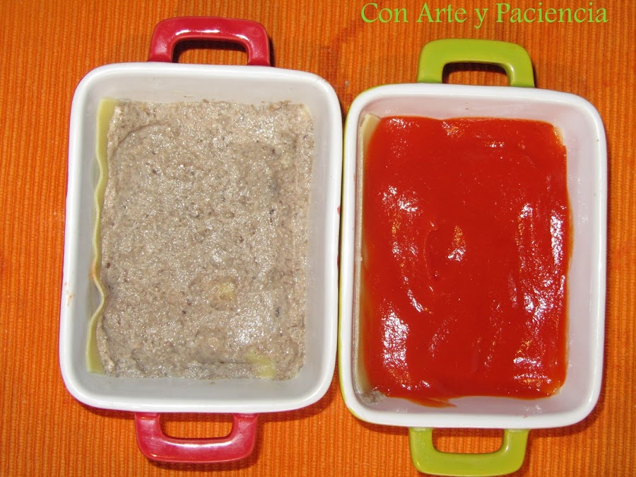 Para la salsa de champiñones (receta más detallada). Troceamos los champiñones y en una olla a fuego medio cocinamos con la tapadera. 15 minutos después añadimos medio vaso de leche. Dejamos destapado para que reduzca y batimos ( receta más detallada) Engrasamos con aceite de oliva el recipiente y montamos cuatro capas.