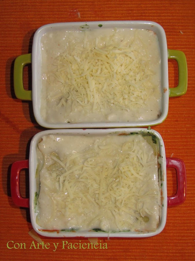 Primera piso: Placa de lasaña crema de champiñones. Tercer piso espinacas