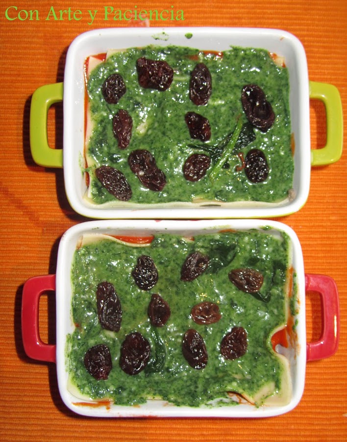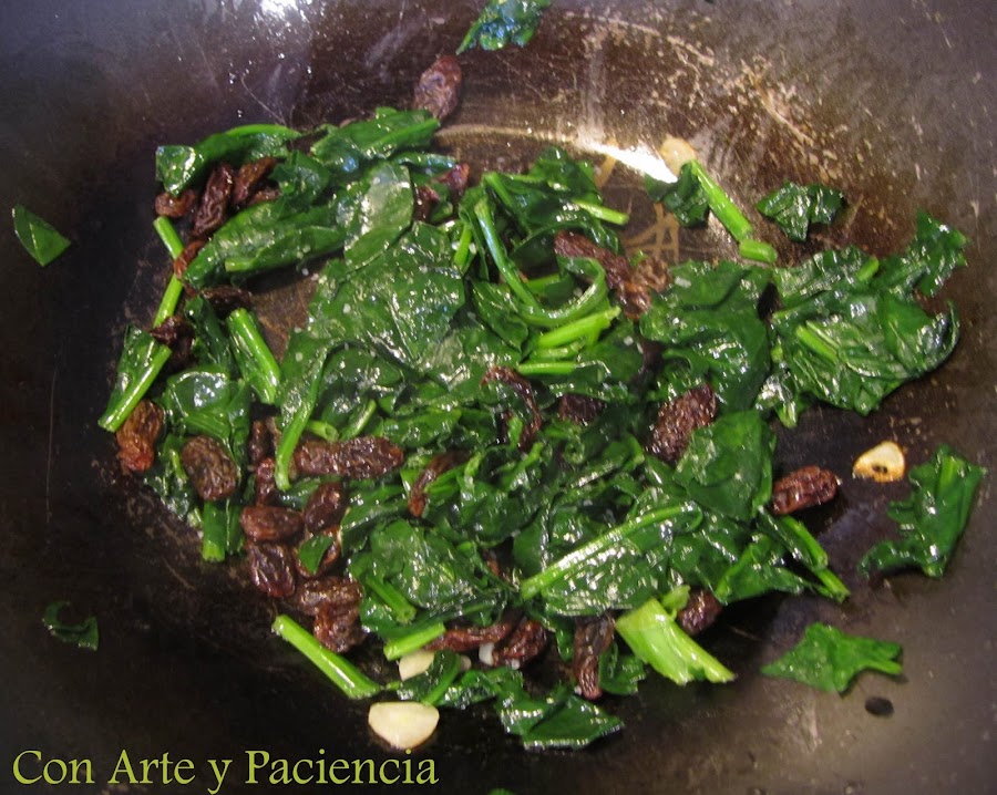 Para la crema de espinacas. En agua hirviendo, echamos las espinacas unos tres minutos. Sacamos y escurrimos. En una sartén, salteamos un ajo laminado y añadimos las espinacas junto con las pasas hidratadas previamente en una taza con agua. Retiramos las pasas, añadimos bechamel y batimos ligeramente.