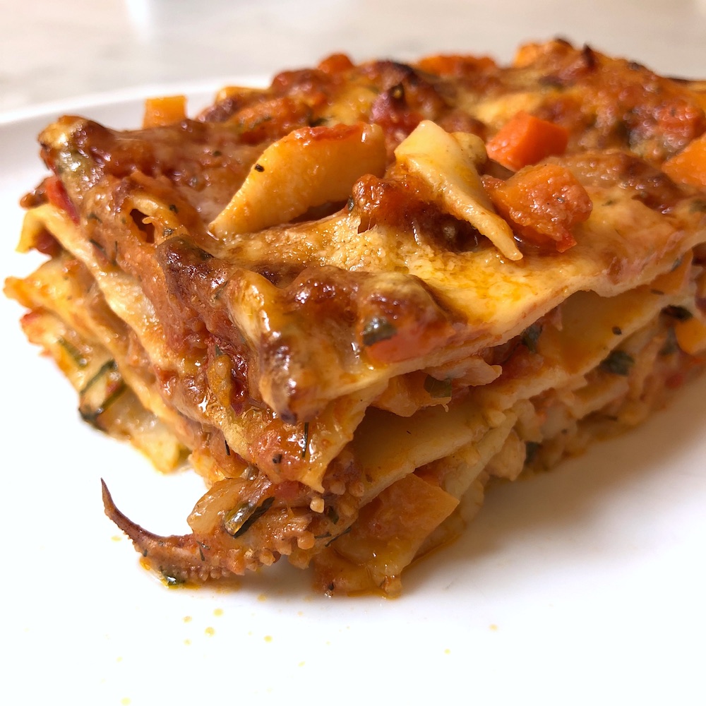 Abadejo 500 gr, langostinos pelados 100 gr, tubos de calamar 100 gr, tentáculos de calamar 100 gr, cebolla picada 1 u, pimiento rojo picado 2 u, dientes de ajo picado 3 u, vino blanco o vermouth seco 50 cc, tomate perita en conserva 2 latas (800 gr), pimentón ahumado o pimentón de la Vera 1 cdta, perejil picado 1 cda, sal, pimienta, aceite de oliva c/n y hojas de lasaña seca 12 u.