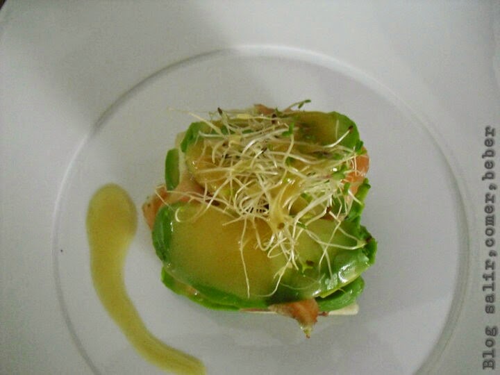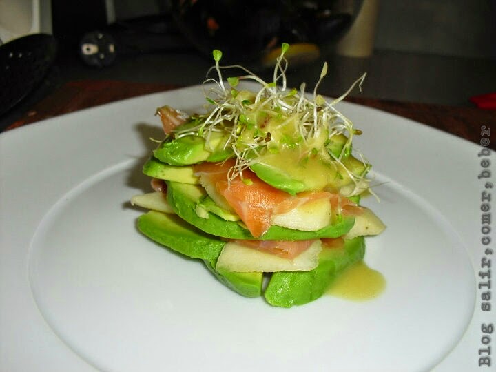 Cortamos los aguacates y las peras en láminas de medio centímetro más o menos y montamos la lasaña intercalando las lonchas de aguacate, pera y salmón ahumado.