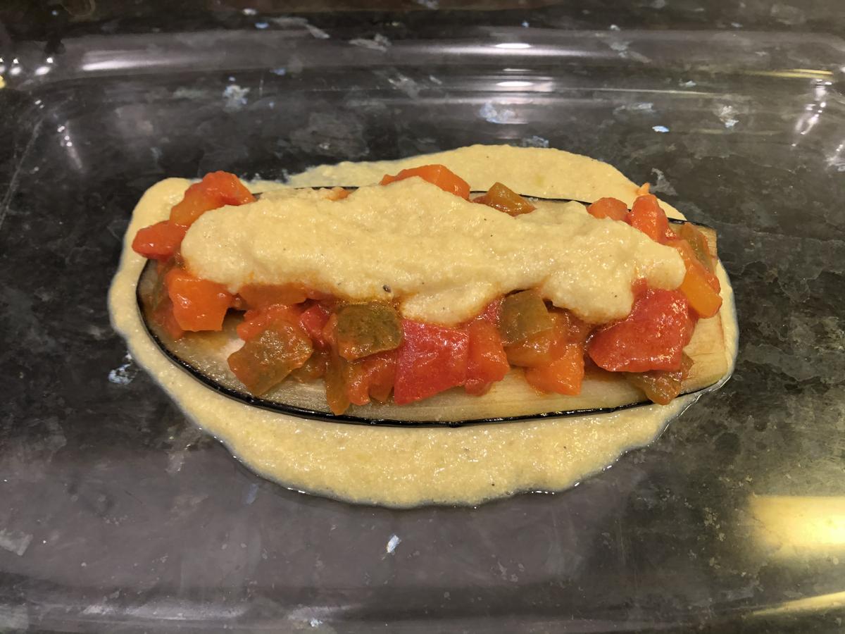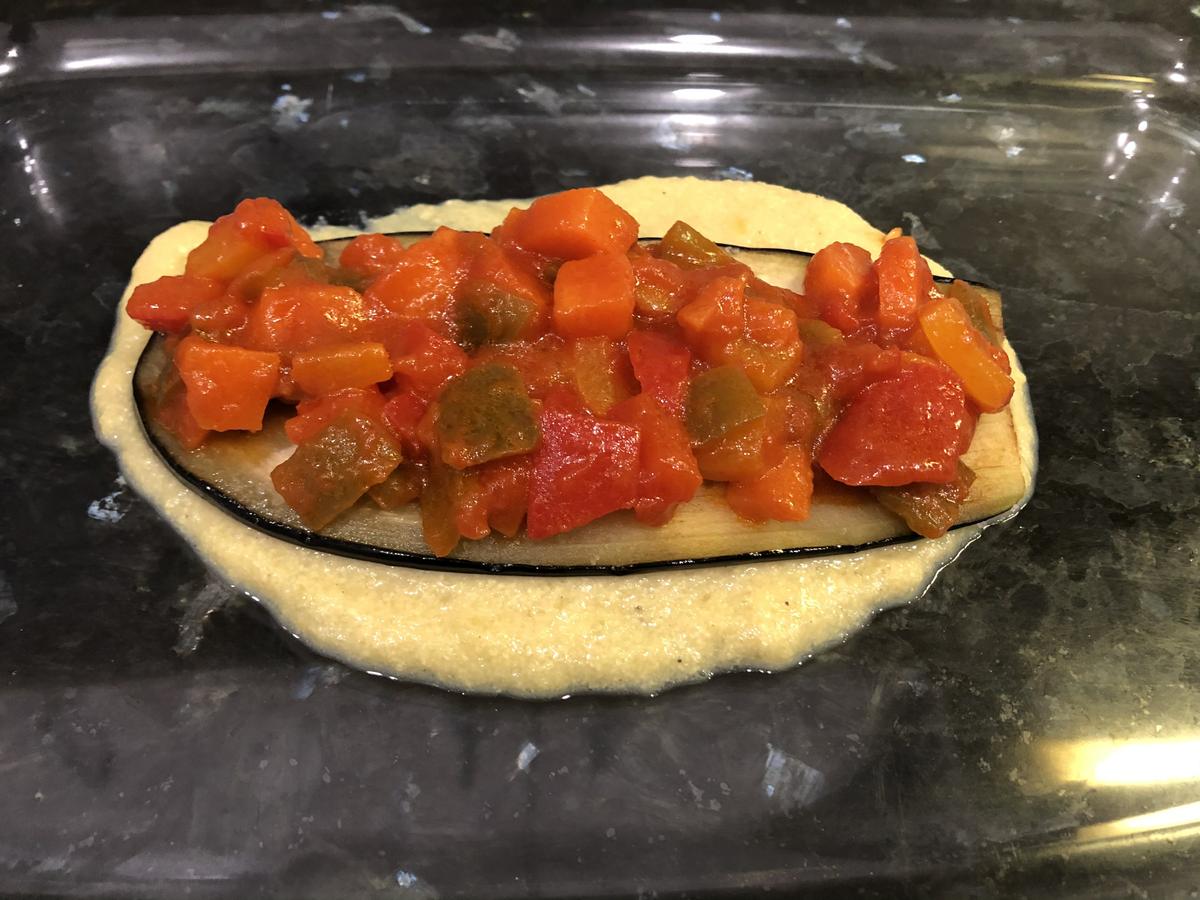 12. Colocamos en la base de una fuente de horno una cucharada de bechamel (o tomate frito si preferimos) o una pincelada de aceite para que no se pegue y la primera lámina de berenjena. Sobre ella, extendemos un poco del sofrito de pimientos, encima del sofrito, un poquito de bechamel y cubriendo todo, otra lámina de berenjena. Repetimos la operación y sobre la última lámina de berenjena, extendemos solo bechamel, sin poner pimientos.
