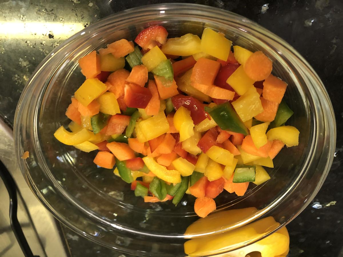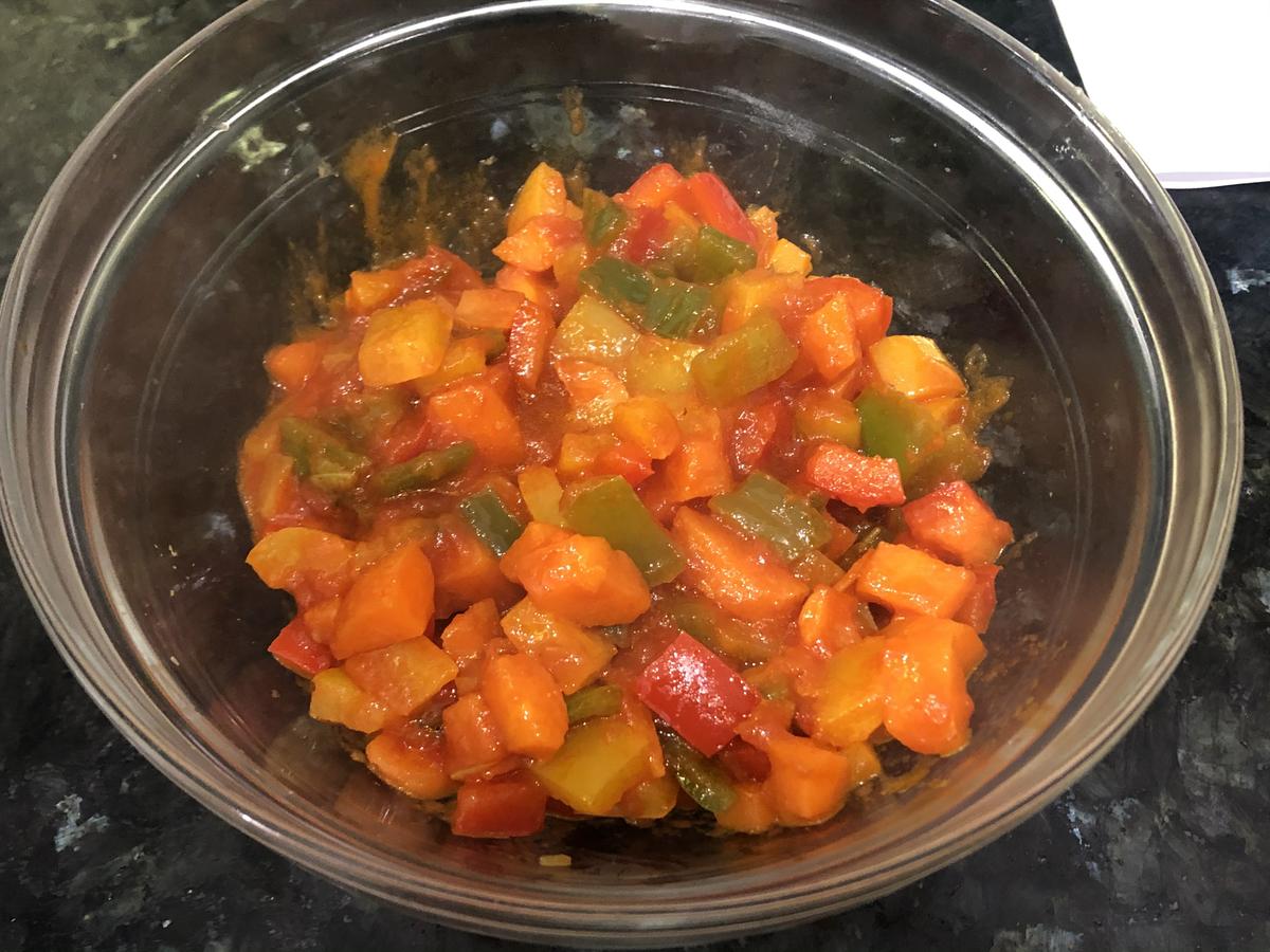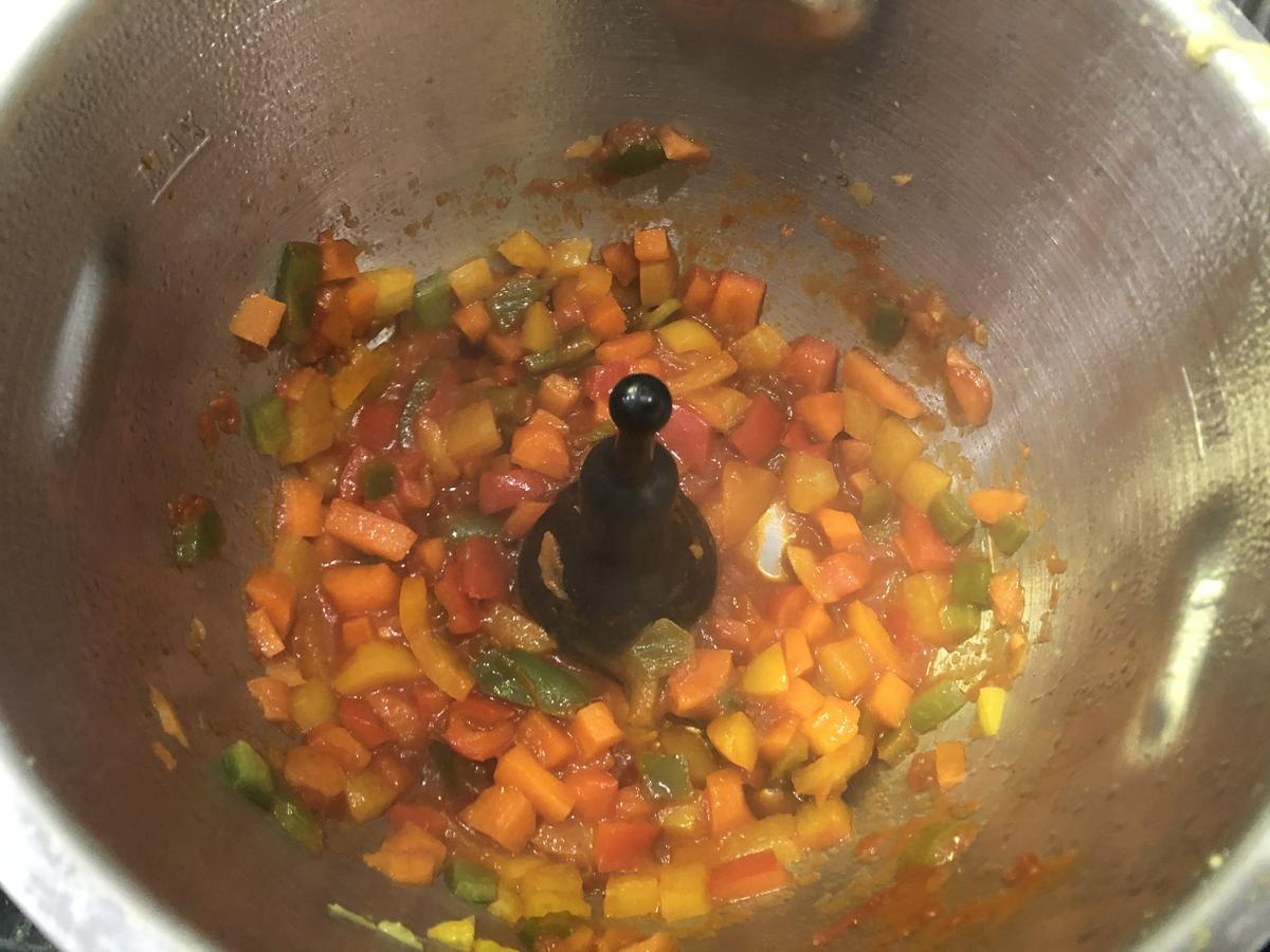 6. Damos un agua al bol y lo equipamos con el mezclador. Picamos los pimientos en cuadraditos que no sean muy menudos y añadimos al bol. A la zanahoria la raspamos la piel, picamos en cuadraditos y añadimos también.