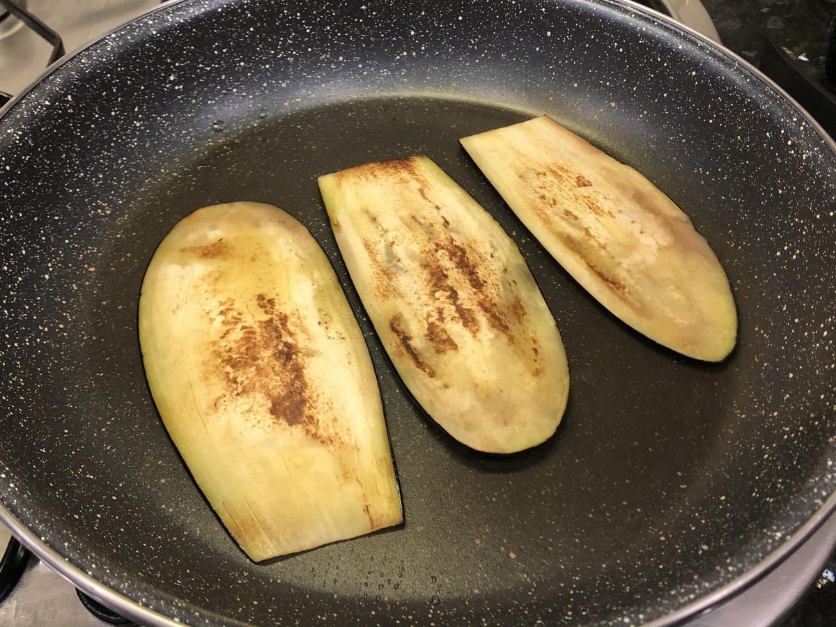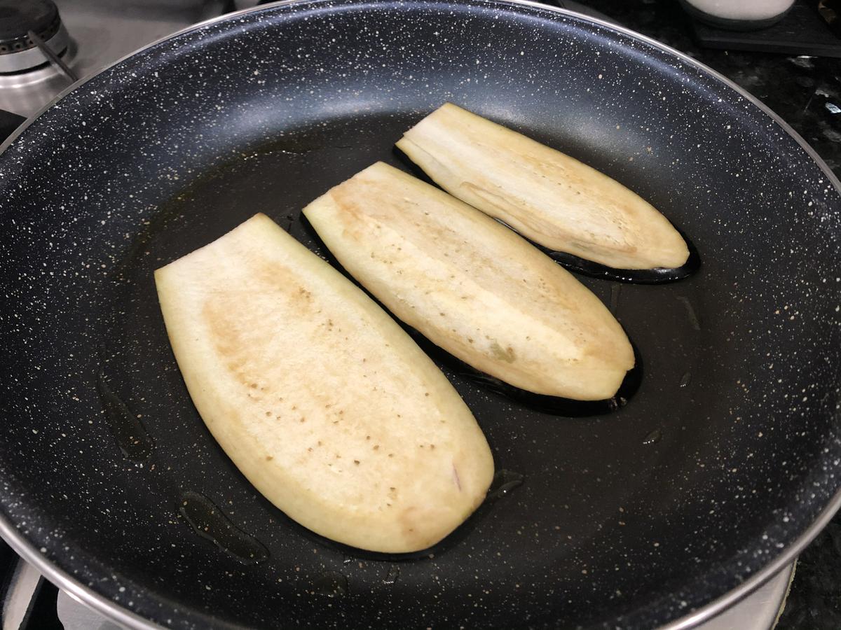 11. Salamos la berenjena y la pasamos por una sartén con una pizca de aceite. Que se haga por ambos lados, pero sin pasarnos de tiempo, ya que al ser tan fina se nos puede quemar rápido.