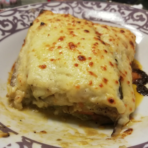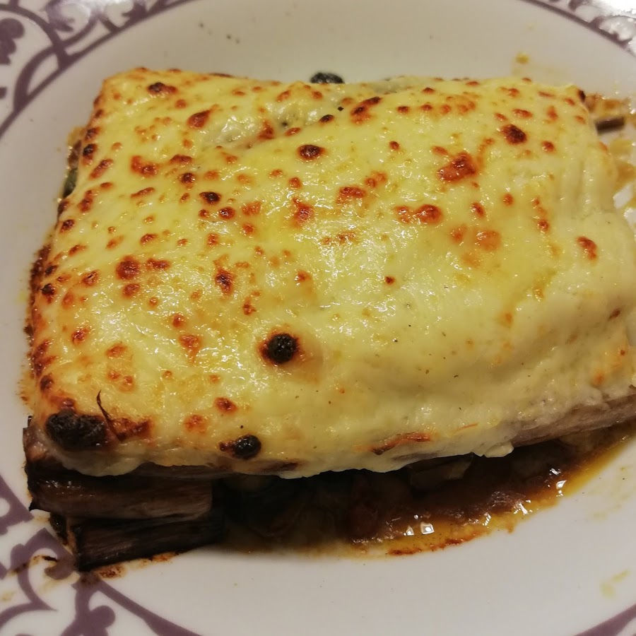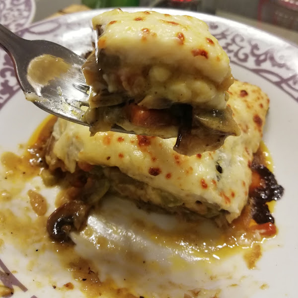 NOTA: Os recomiendo que la hagáis unas horas antes y la dejéis reposar en la nevera, así la bechamel enfriará y la lasaña tendrá más consistencia a la hora de cortar las porciones. Pero si tenéis prisa, directa al horno que también está muy rica.