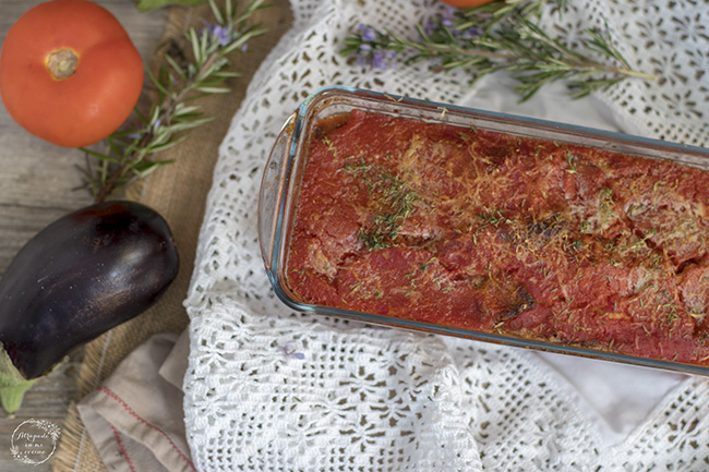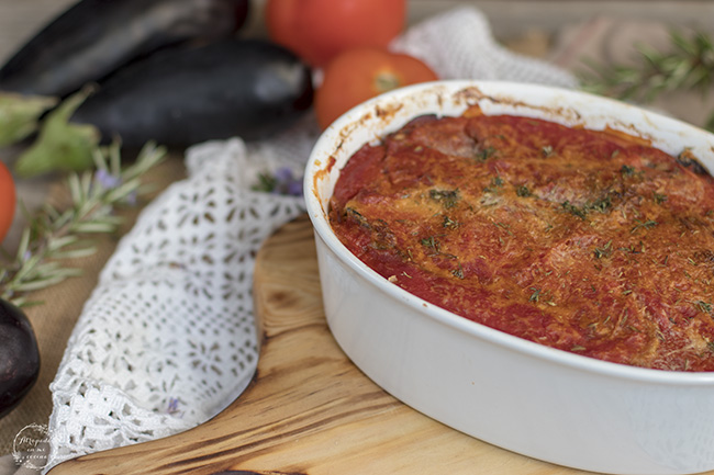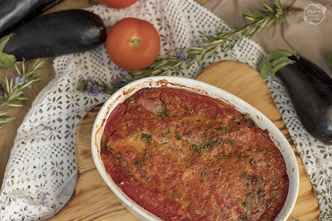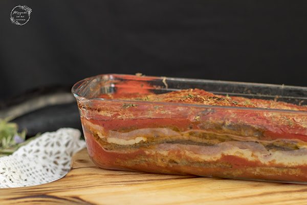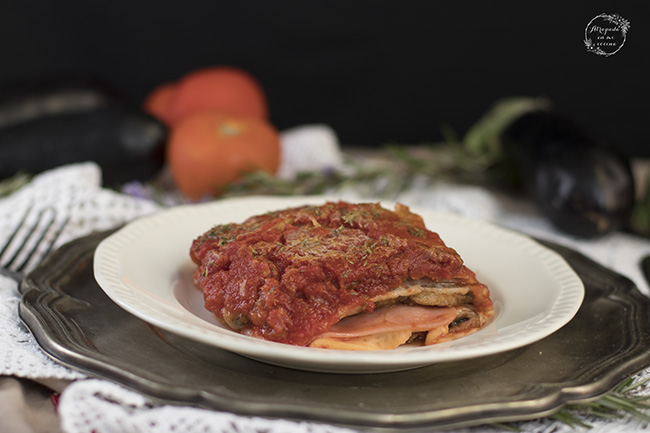 Se trata de una falsa lasaña con capas de berenjena frita, tomate frito, queso en lonchas y de jamón de York, terminando con una capa de tomate frito espolvoreado con hierbas aromáticas y con queso rallado.