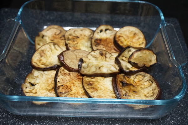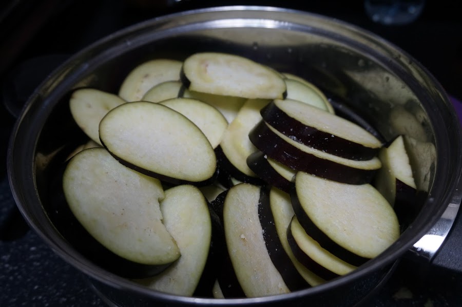 Pelamos las berenjenas y las cortamos a rodajas, las salamos y las dejamos escurriendo unos 15 minutos.