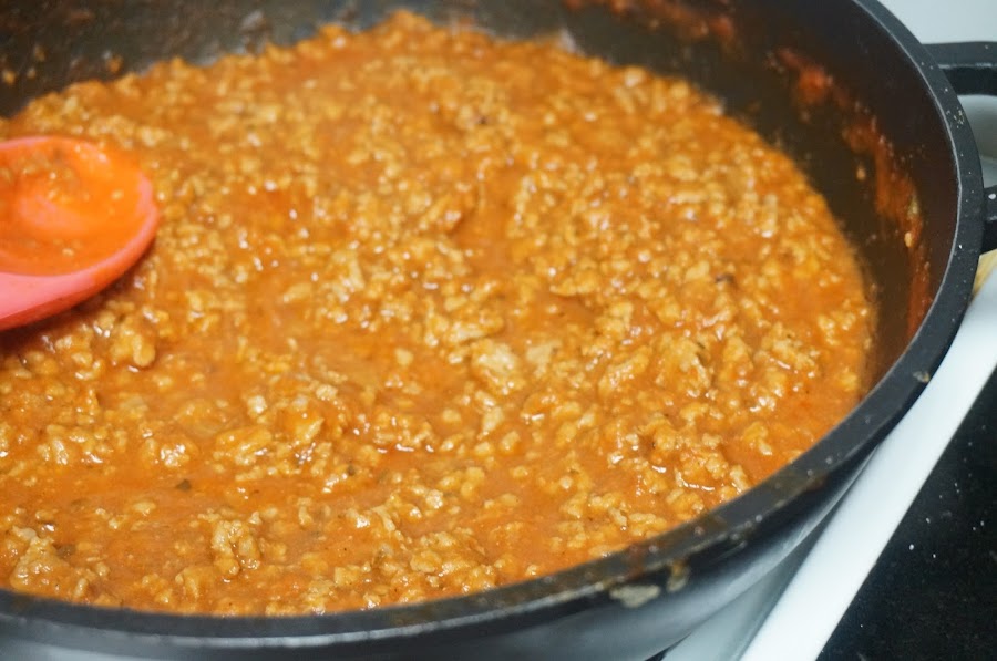 Echamos la salsa de tomate, un poco de sal y pimienta, lo dejamos cocinar unos 10 minutos.