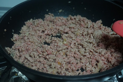 Preparamos la carne en una sartén. ponemos la cebolla picada y la rehogamos, ponemos la carne picada y la cocinamos un poco.
