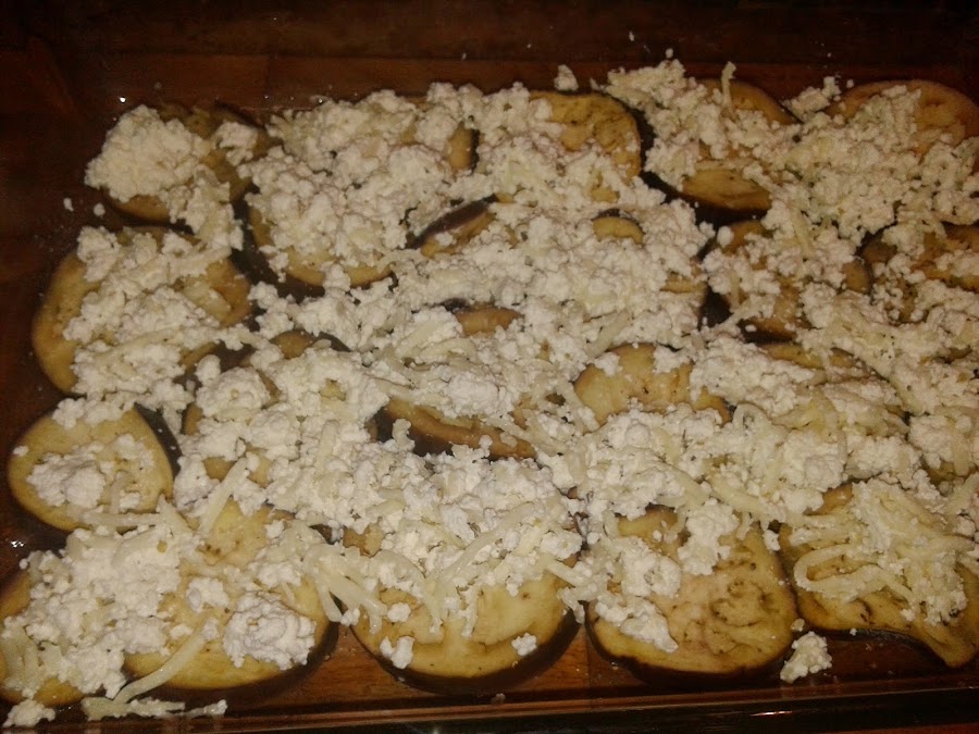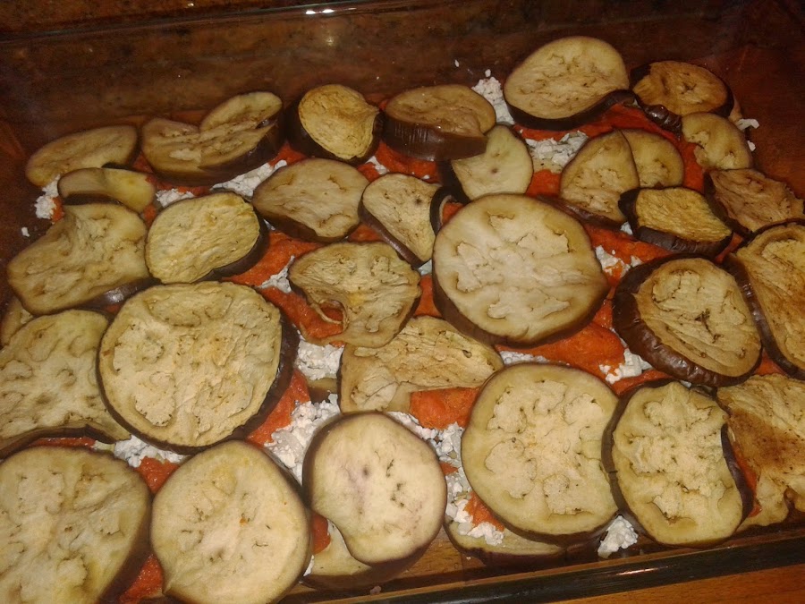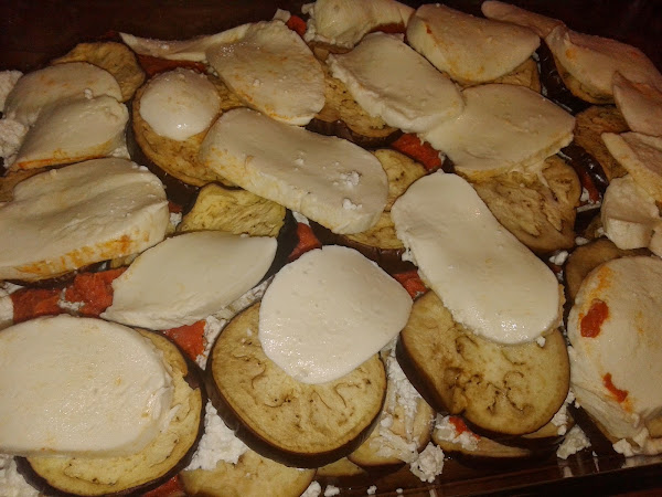 Colocamos una capa de esta mezcla por encima de la capa de berenjenas.