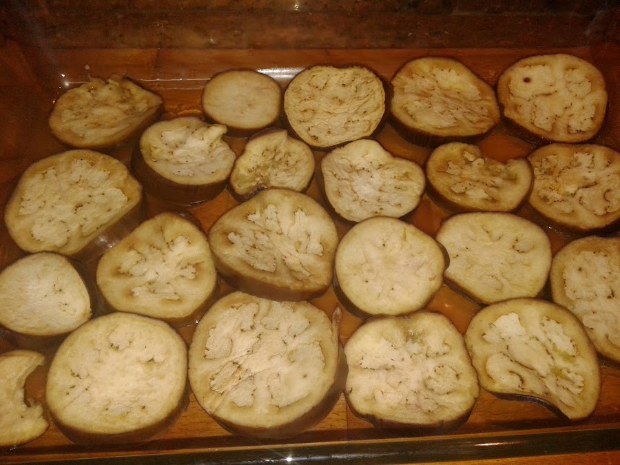 una vez pasado este tiempo, pintamos una fuente para horno con aceite y colocamos una capa de berenjena.