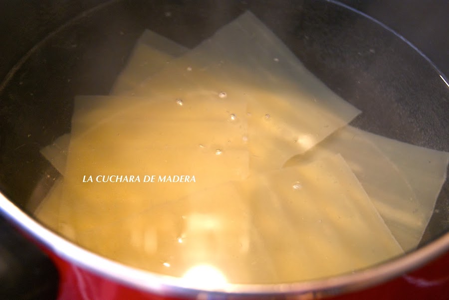 Mientras se hacen, cocinamos las placas según indique las instrucciones de la marca que se utilice; en mi caso se sumergen en agua caliente unos 10 minutos hasta que estén blandas
