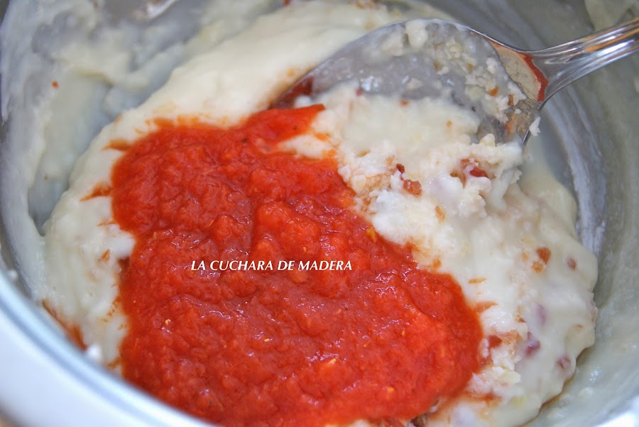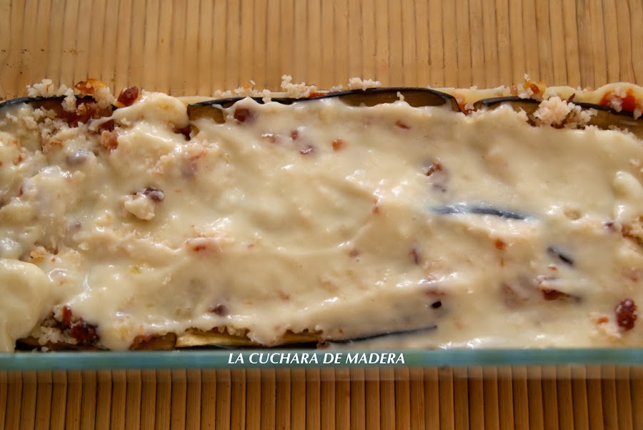 Mezclamos la bechamel que nos queda, con dos cucharadas sopera del tomate y lo que nos sobra del picado, lo ponemos encima de la última capa de berenjenas