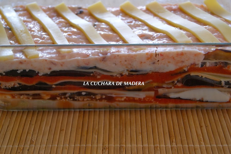 Cortamos 2 lonchas de quesos en tiras de un centímetro más o menos de ancho, las colocamos encima para adornar y lo metemos al horno unos 15/ 20 minutos a 180 grados; como el horno ya esta caliente de hacer las berenjenas se terminarán en es tiempo.