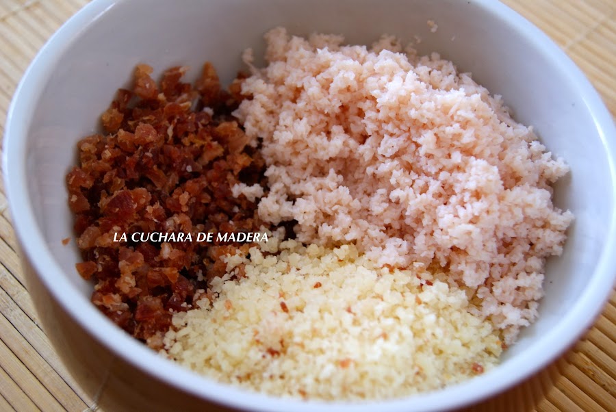 Picamos el pavo, el jamón serrano y el queso parmesano,lo mezclamos y reservamos