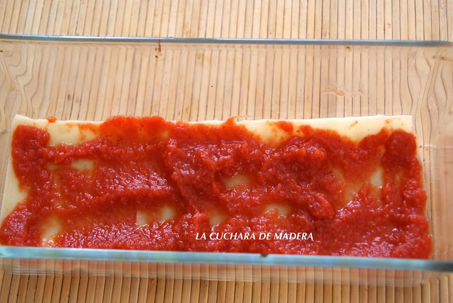 En una fuente de horno, ponemos un hilo de aceite en la base,cubrimos con las placas de lasaña y encima el tomate natural triturado