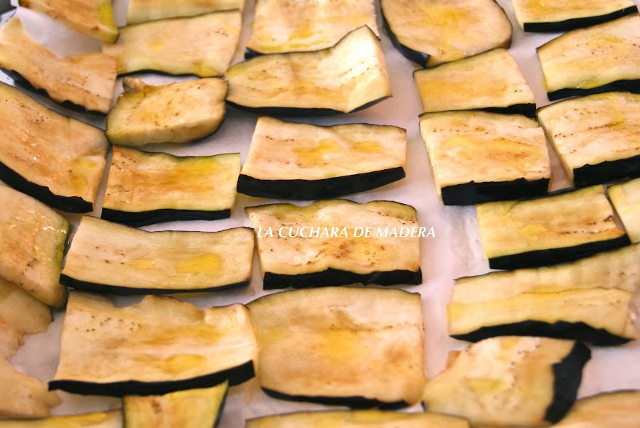 Partimos las berenjenas finas, las cubrimos de sal gruesa y las dejamos unos 15 minutos; las lavamos y secamos bien,colocándolas sobre una bandeja con papel vegetal y unas gotas de aceite de oliva extra por encima.Las metemos en el horno unos 15 minutos dándoles la vuelta a los 7 minutos de estar en el horno