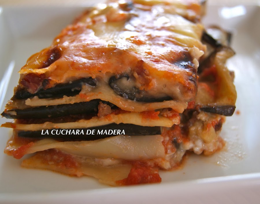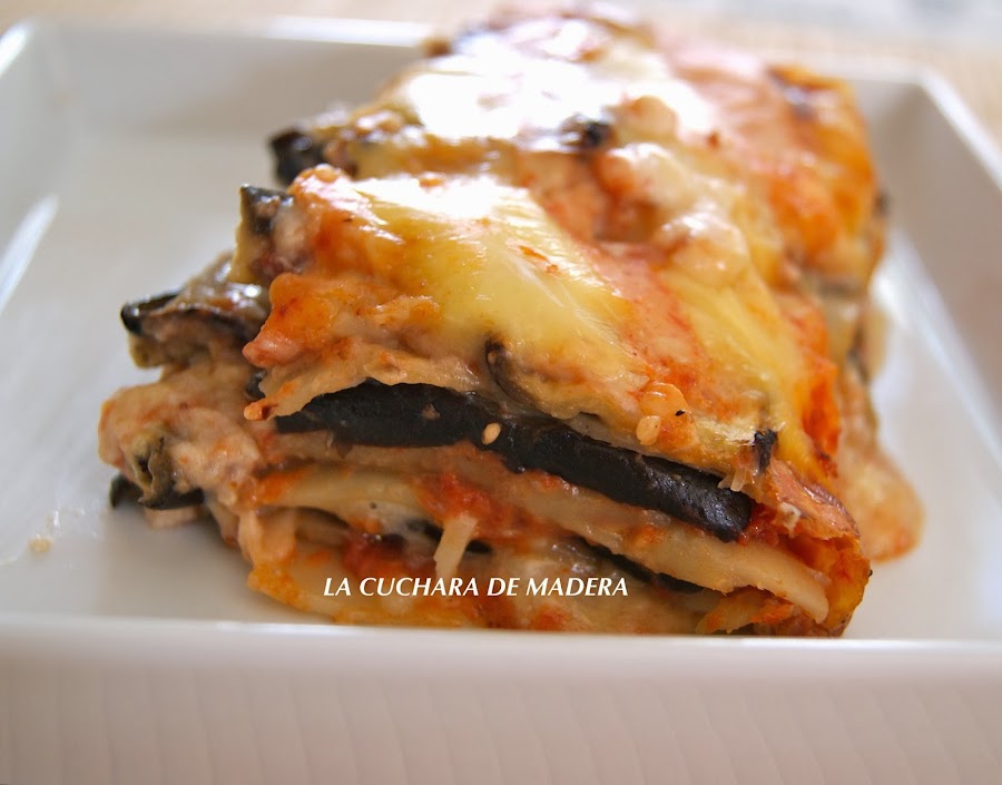 En un plato colocamos un trozo de la lasaña, intentando que no se caiga ni ladee hacia los lados ya que es bastante alta; primero la he cortado con el cuchillo y después me he ayudado de las tijeras para que los trozos salgan limpios y no tirar de las berenjenas.