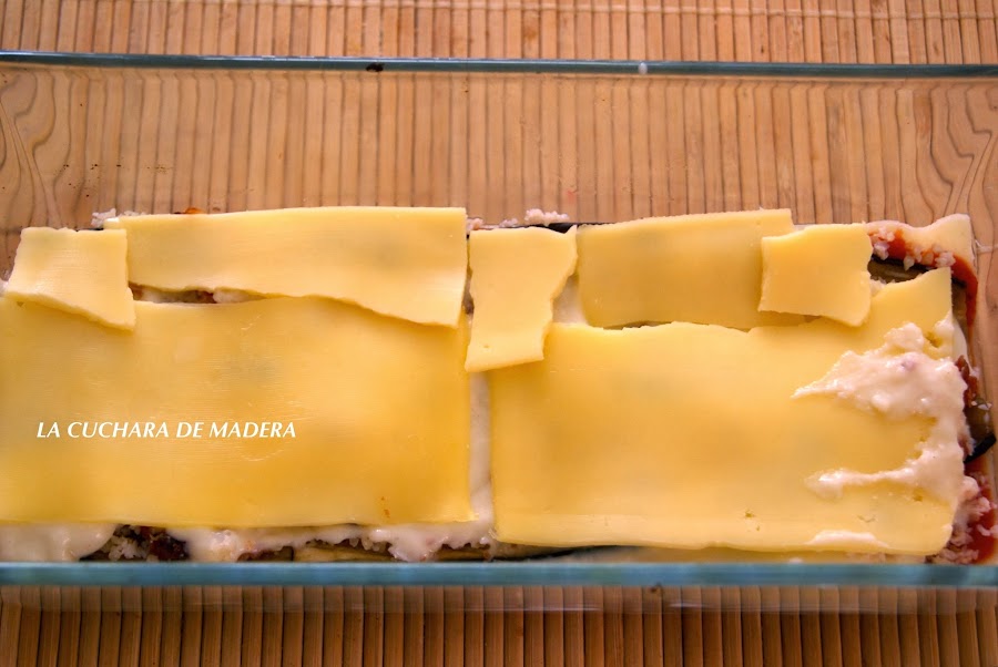 Repetimos toda la operación realizada, placas,tomate,berenjena, el picado de pavo, jamón y parmesano,bechamel y queso dos veces más