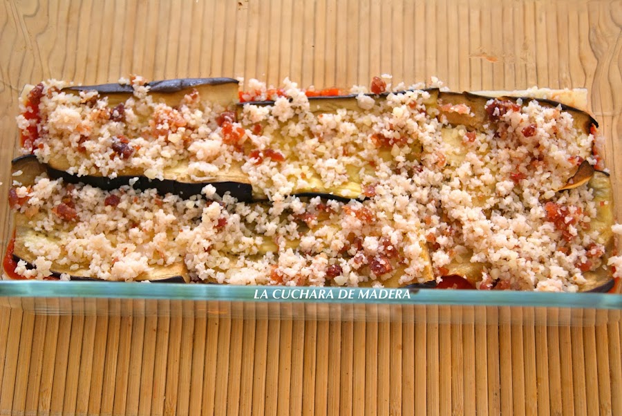 Ahora pondremos una capa de berenjenas, sobre estas el picado de pavo, jamón serrano y parmesano
