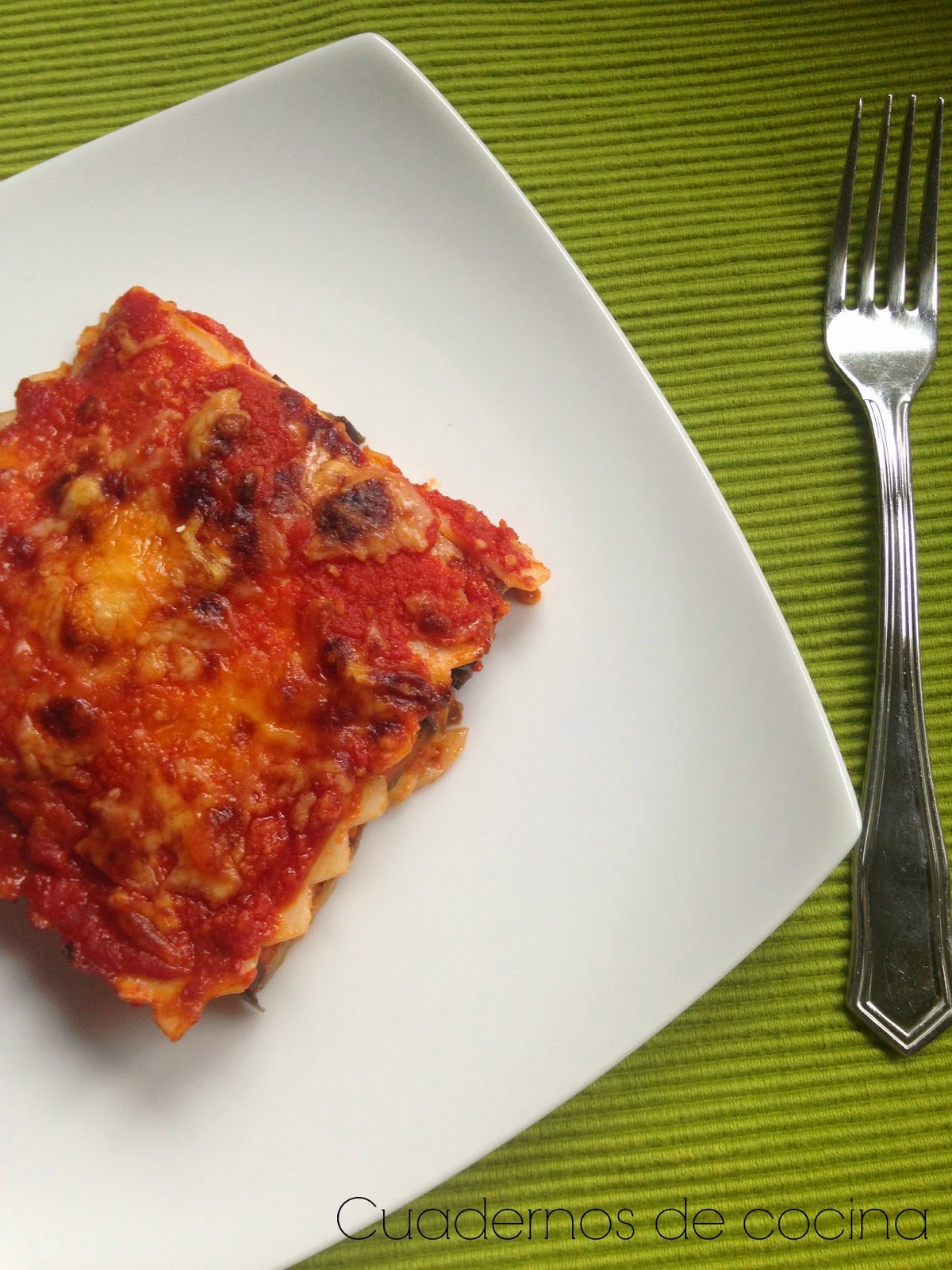 En una fuente engrasada, apta para el horno, colocamos una capa de pasta para lasaña y encima unas rodajas de berenjena. Cubrimos con queso de mozzarella y queso parmesano. Regamos con salsa de tomate y encima repetimos, otra capa de berenjena, queso y tomate. Cubrimos con otra lámina de pasta y tomate frito. Espolvoreamos con queso parmesano rallado y metemos al horno a gratinar unos 15 minutos.