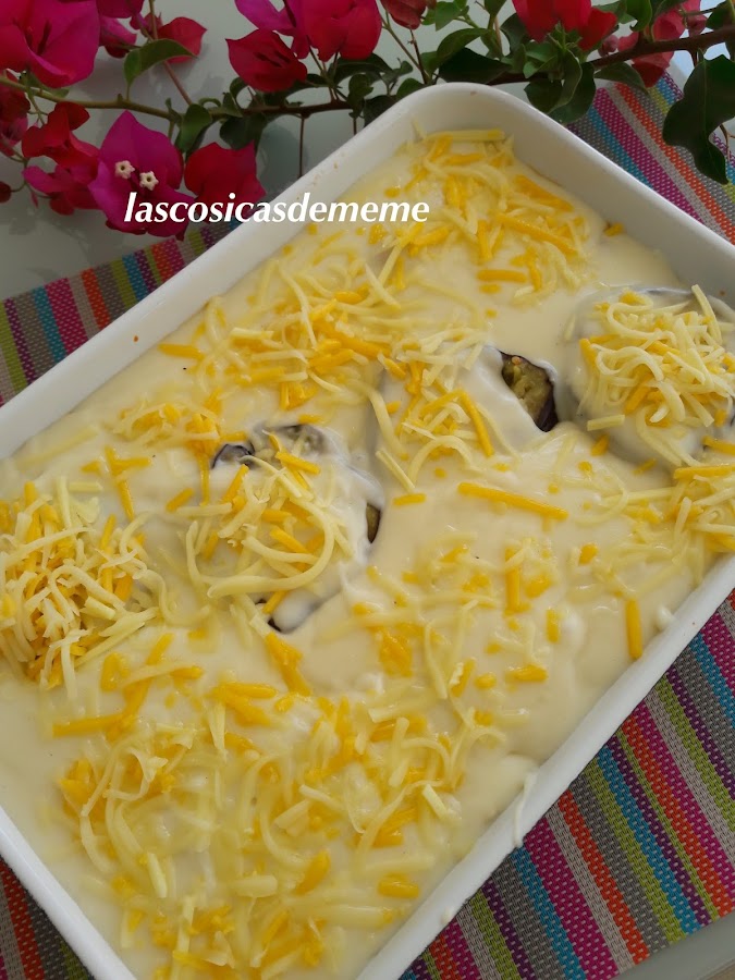 Ponemos toda esta mezcla en una fuente apta para el horno convencional, colocamos encima las rodajas reservadas, cubrimos con la bechamel y queso rallado....