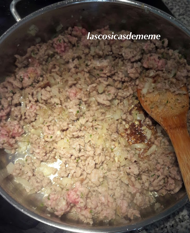 Añadimos la carne picada, en cuanto veamos qué cambia el color, añadimos el tomate, dejamos unos minutos que se sofría todo. Reservamos.