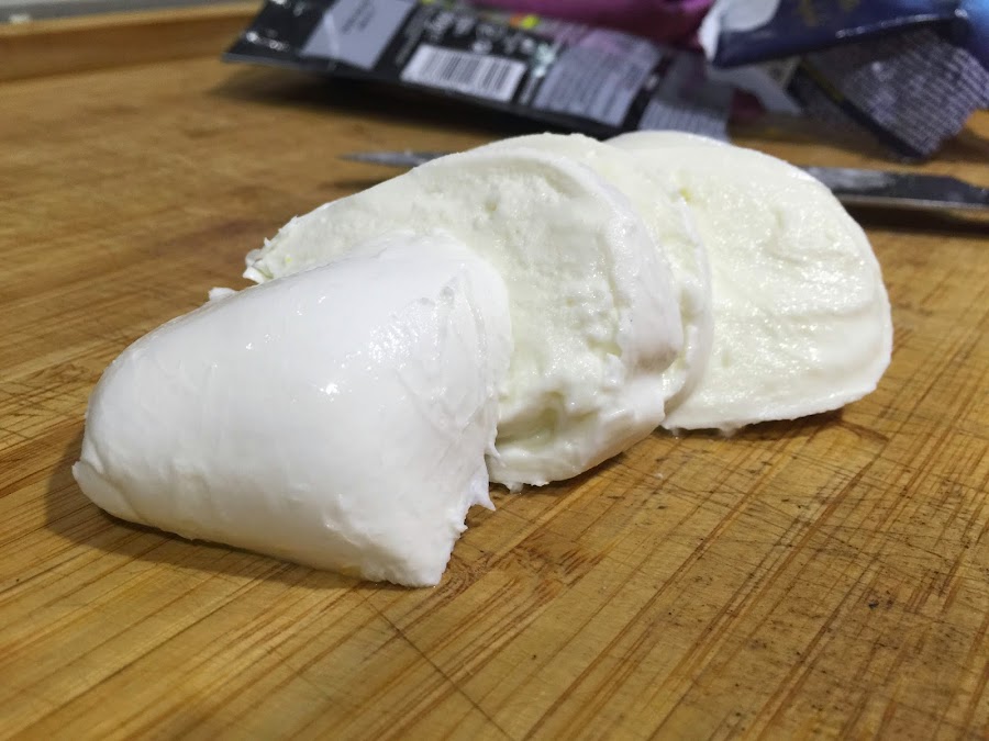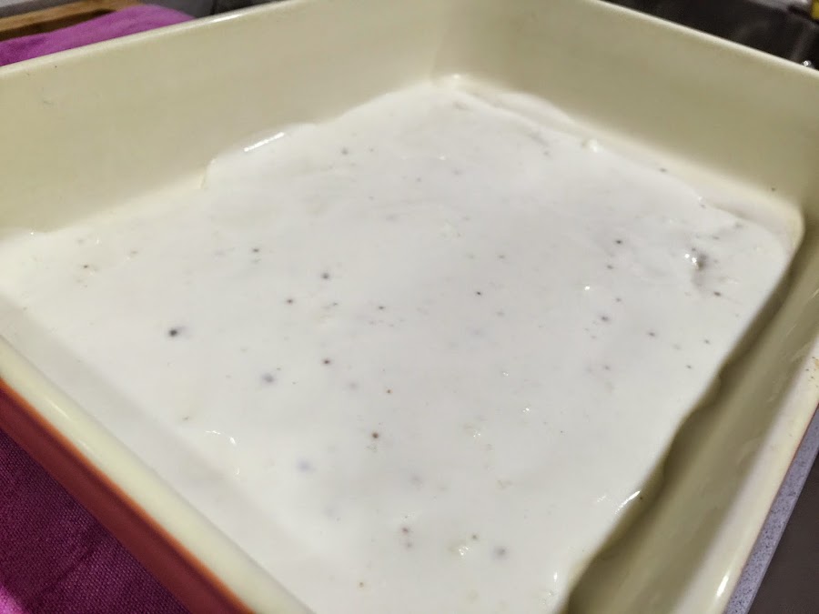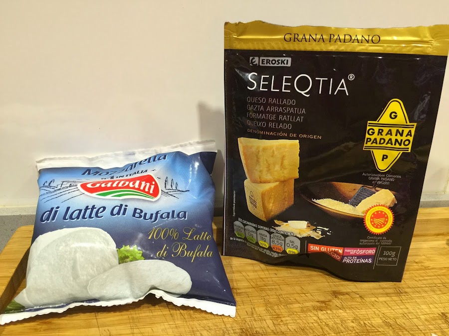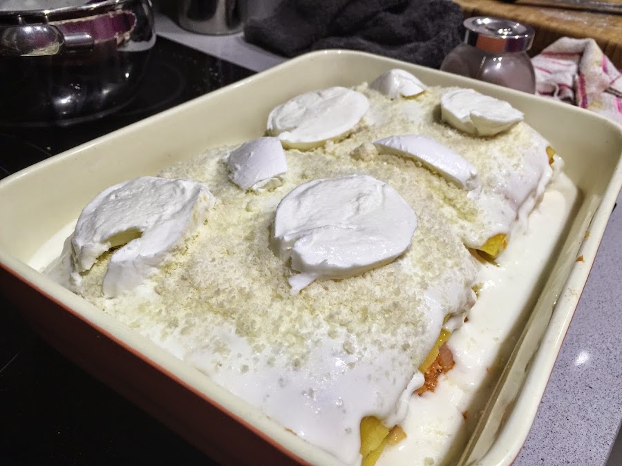 13. Cubrimos toda la superficie con la bechamel que hemos preparado. Encima de la bechamel ponemos el queso parmesano en polvo y la mozzarela de buffala en rodajas.