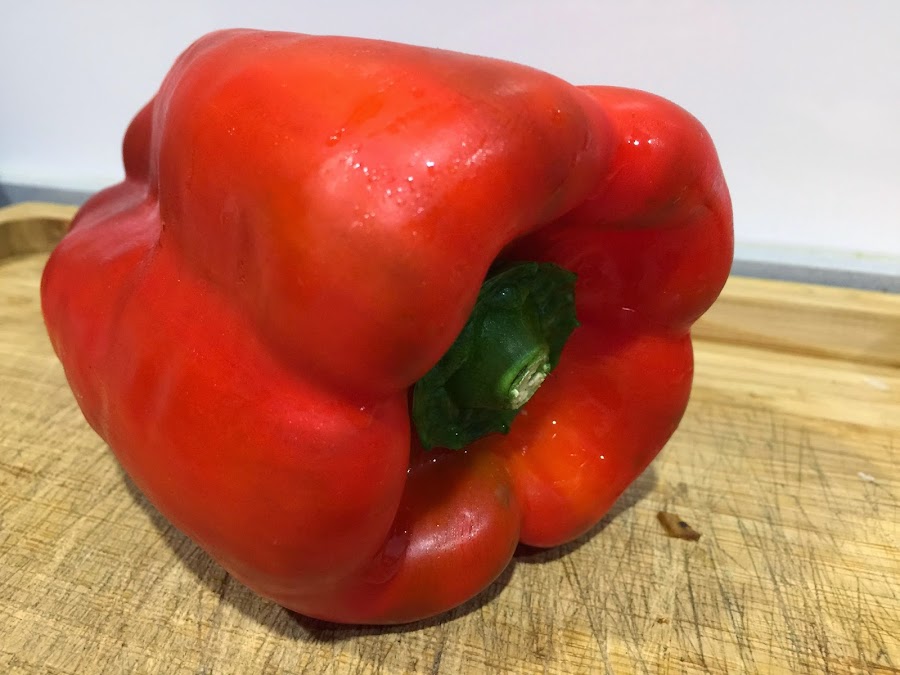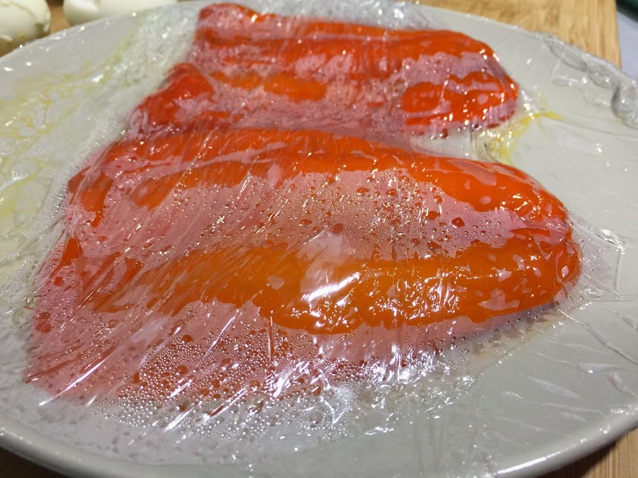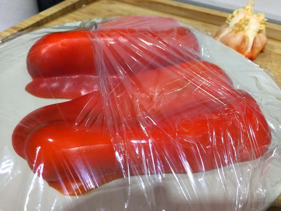 3. Preparamos el pimiento rojo. He utilizado la técnica que propone Carlos. Lavamos el pimiento, con la punta del cuchillo lo marcamos en cruz por toda la superficie, lo ponemos en un plato y lo cubrimos con film. Después lo metemos en el microondas durante 10 minutos a la máxima potencia. Dejamos enfriar dentro del film y a posterior cuando haya enfriado lo pelamos.