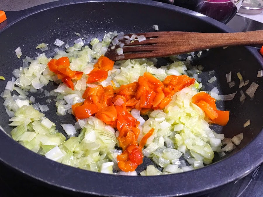 5. Una vez la cebolla esté pochada añadimos el pimiento morrón a trocitos también y rehogamos durante 5 o 6 minutos más a fuego bajo.