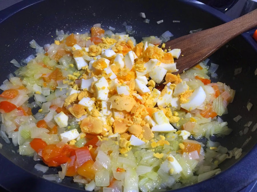 6. Pelamos los dos huevos duros, los troceamos a trozos pequeños y los añadimos a la sartén.