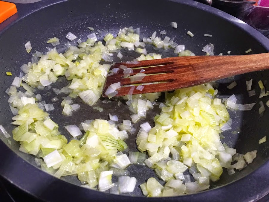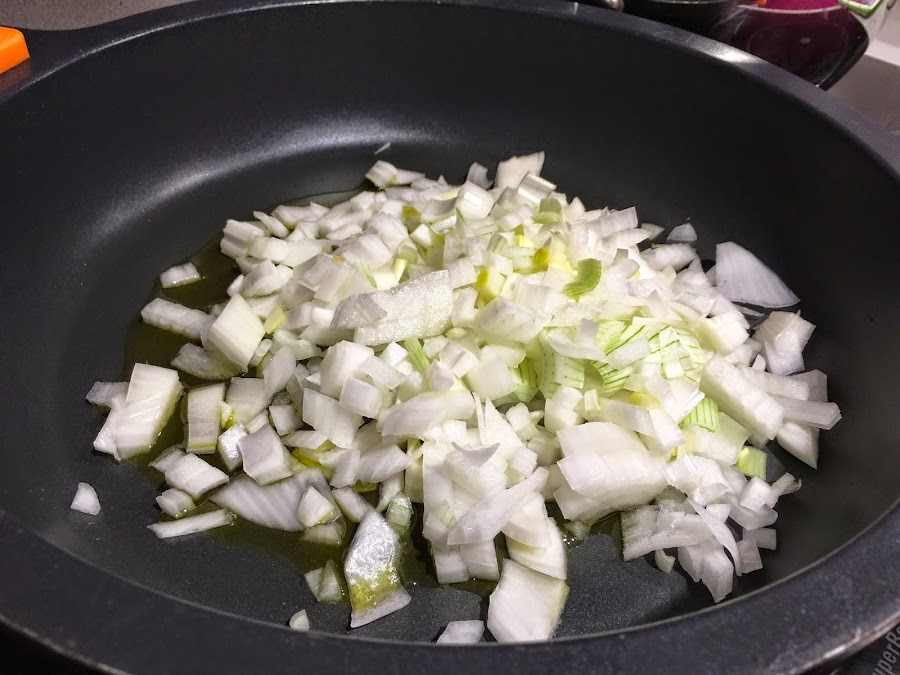 4. Cortamos y picamos las cebollas en trozos pequeños. Ponemos AOVE en una sartén y la pochamos durante 5 minutos.
