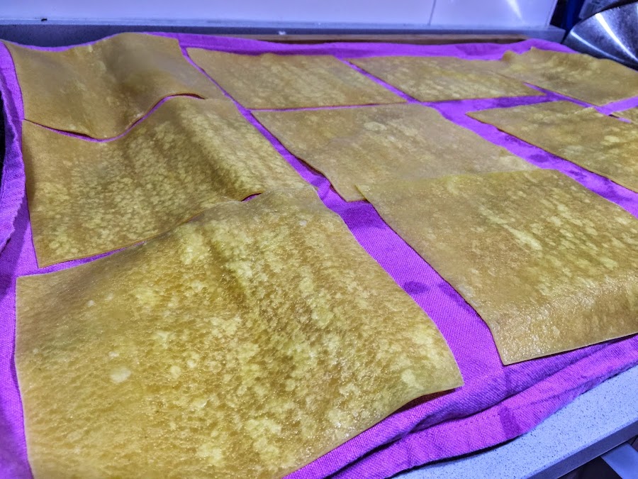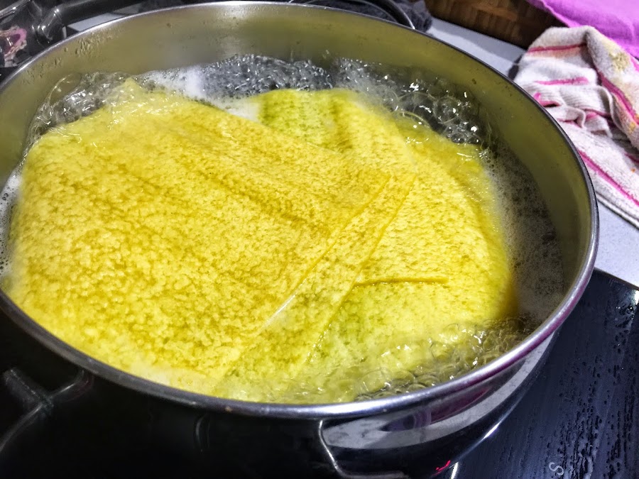 11. Cocemos las placas de la lasaña. Al ser pasta fresca con un par de minutos será suficiente. Las retiramos a un paño de algodón y cubrimos con otro paño de algodón para que absorba el agua sobrante.