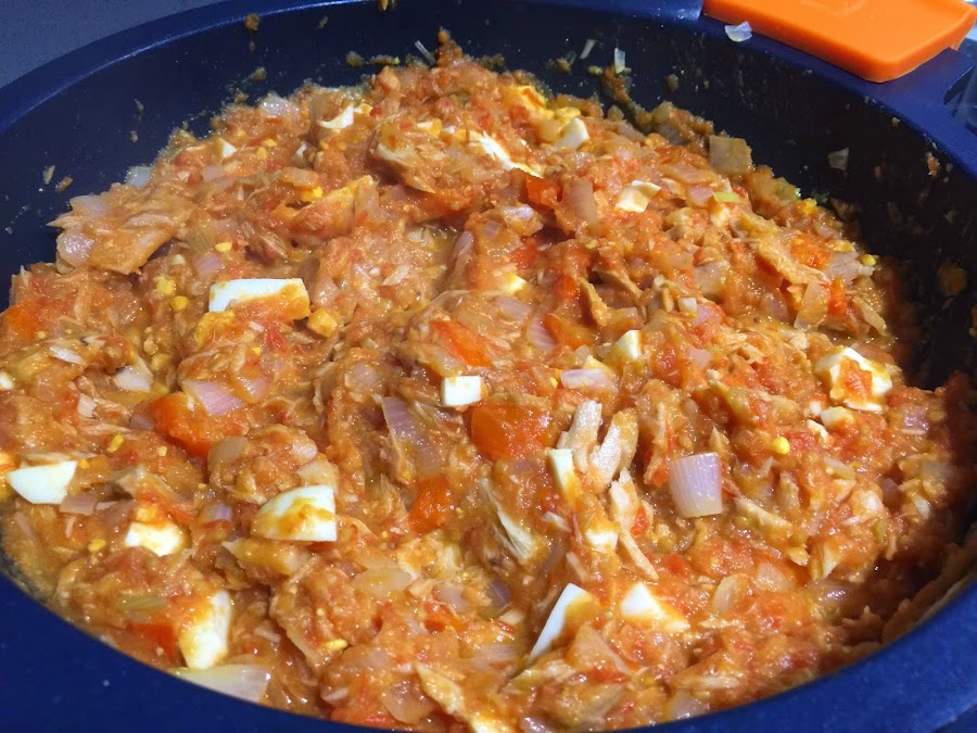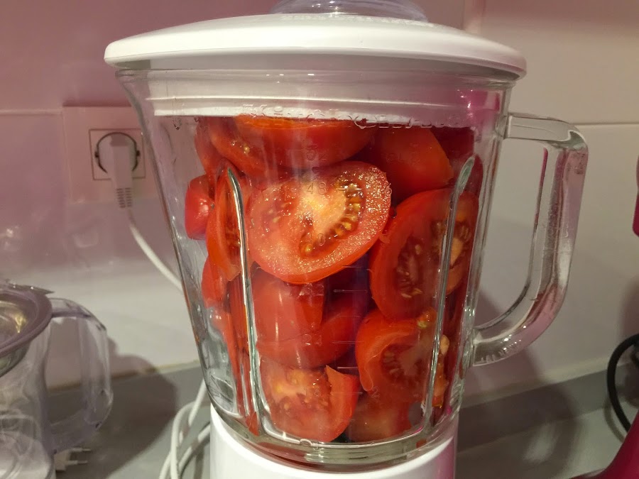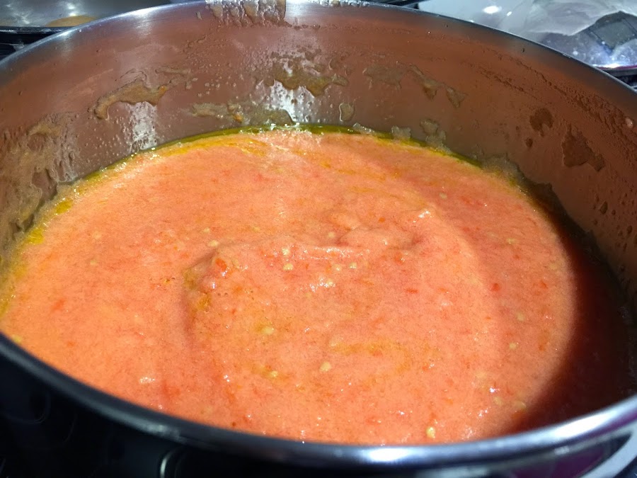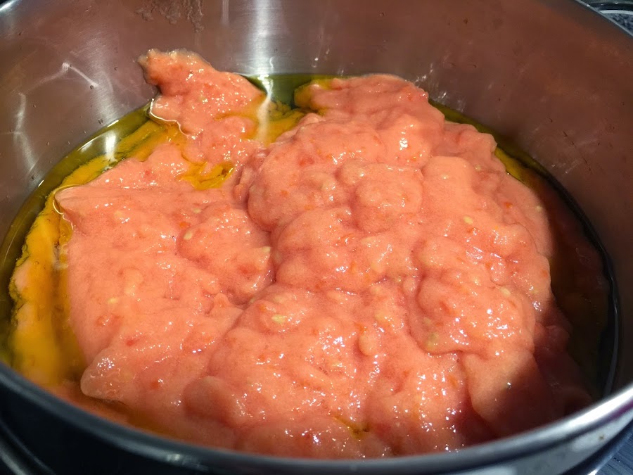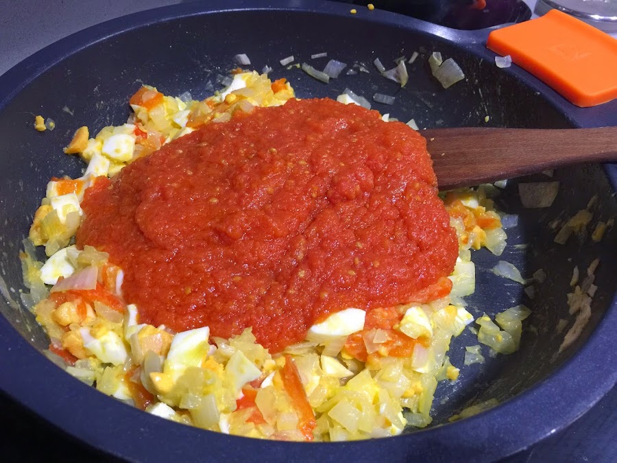 2. Mientras se van cociendo los huevos, podemos ir preparando la salsa de tomate. Empezamos lavando y triturando el quilo de tomates. Ponemos en una olla un poquito de aceite de oliva virgen extra con el tomate triturado y dejamos freír a fuego lento durante aproximadamente 1 hora, salamos al gusto. Debemos ir removiendo para vigilar que no se nos queme. No debe quedarnos una consistencia demasiado líquida, mejor espesita que así aportara un sabor más intenso y menos aguado.