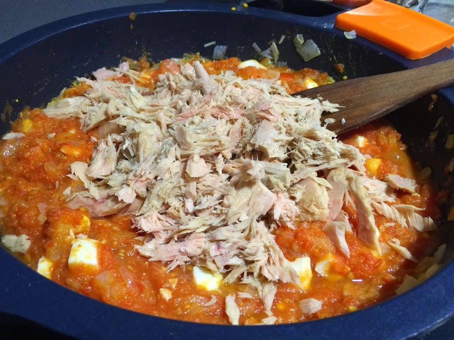 8. Preparamos el bonito, para ello, lo escurrimos bien antes. Si no lo hiciésemos nos quedaría encharcado de aceite y estropearía nuestra lasaña. Desmigamos bien los lomos de bonito ya escurridos y los añadimos a la sartén.
