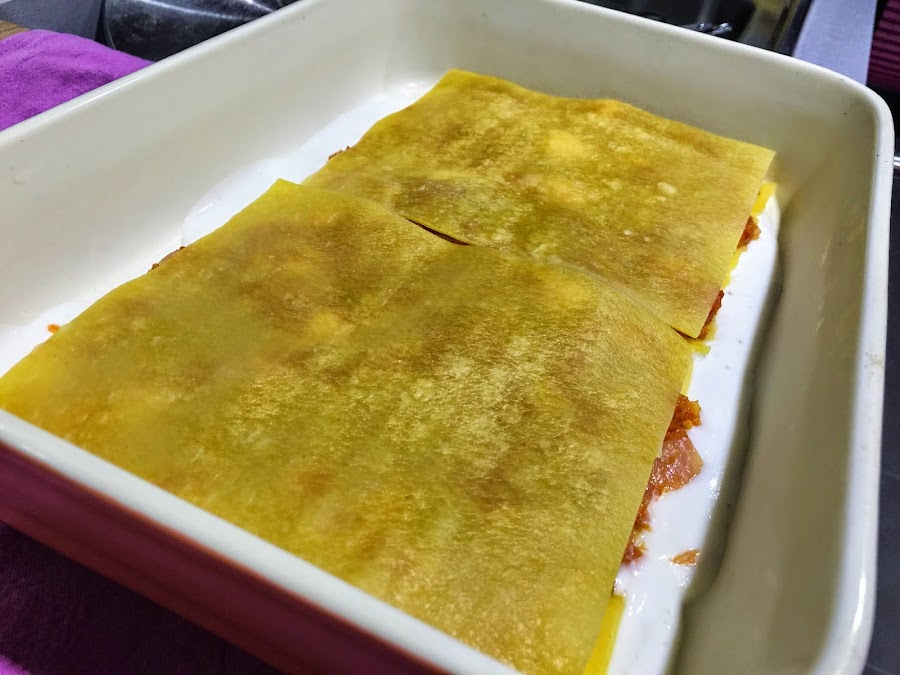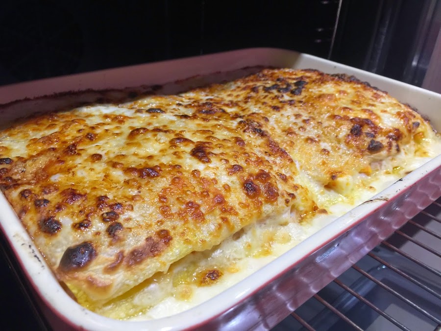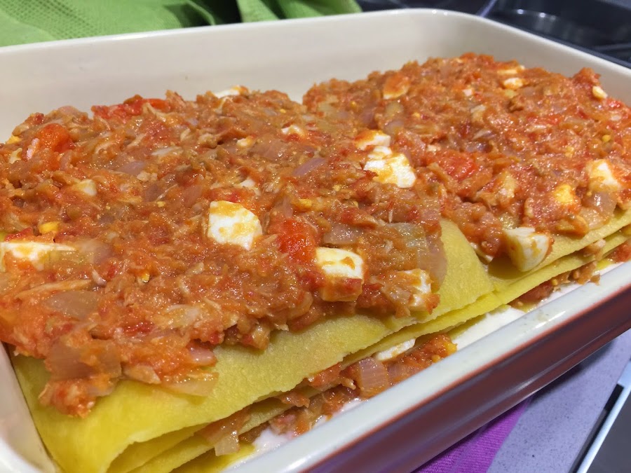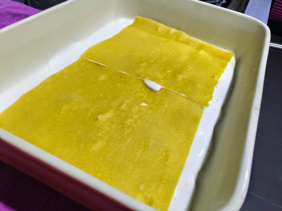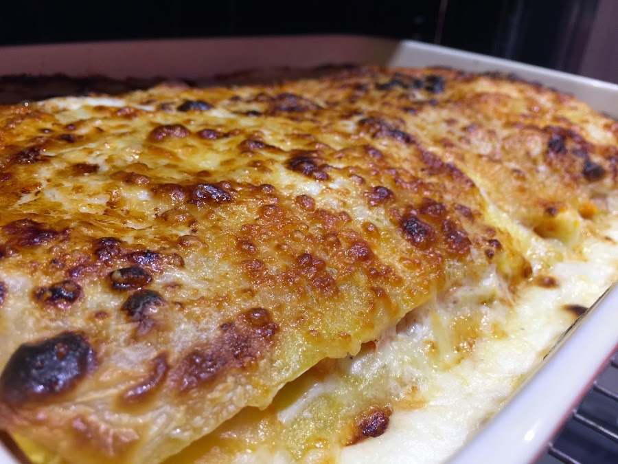 12. Ya tenemos todo listo para preparar el montaje de nuestra lasaña. Cogemos la fuente de cristal y cubrimos la superficie con un poco de bechamel. Cubrimos con una capa de lasaña. Encima ponemos 1/4 del relleno de atún. Volvemos a cubrir con las placas de lasaña. Encima ponemos otro 1/4 del relleno. Cubrimos con las placas de lasaña. Y así sucesivamente hasta poner las 5 capas de pasta y las 4 de relleno.