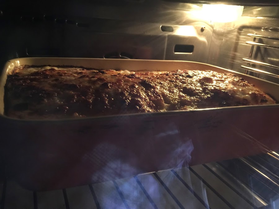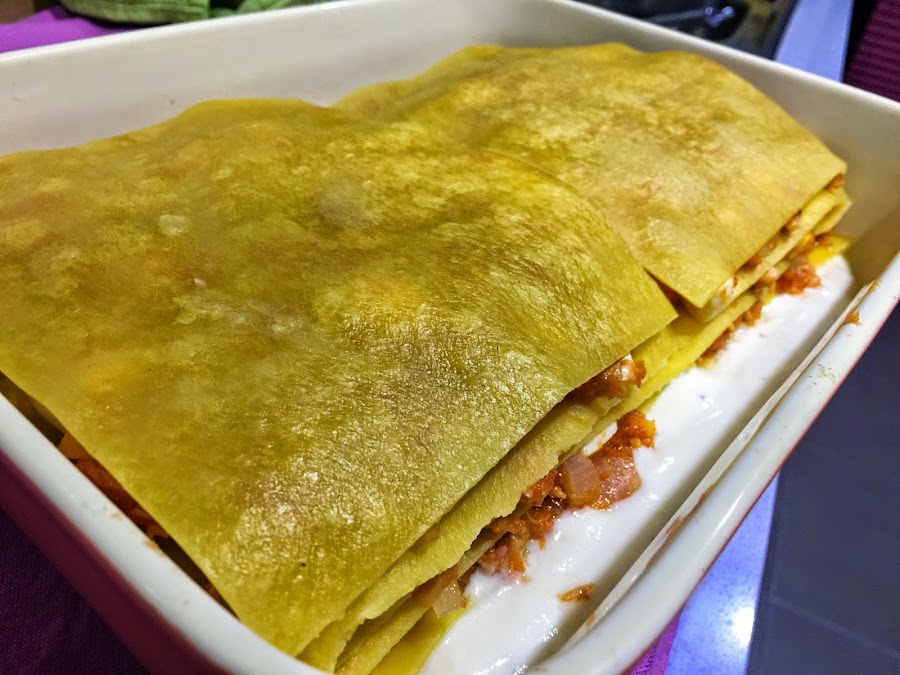 7. Añadimos la salsa de tomate que previamente habíamos preparado, reservando un pelín para la base de la bandeja dónde prepararemos la lasaña.