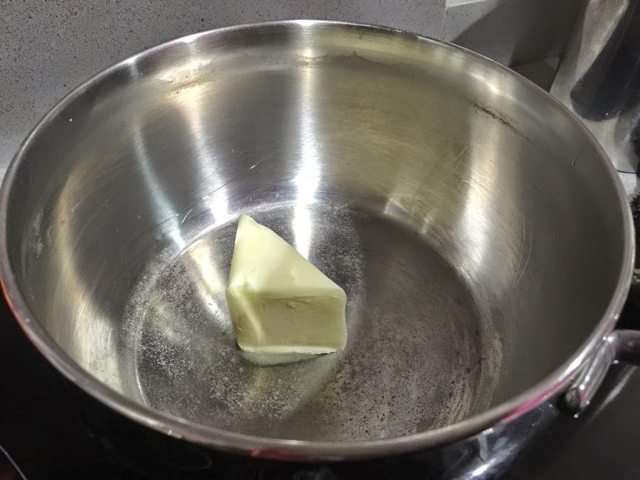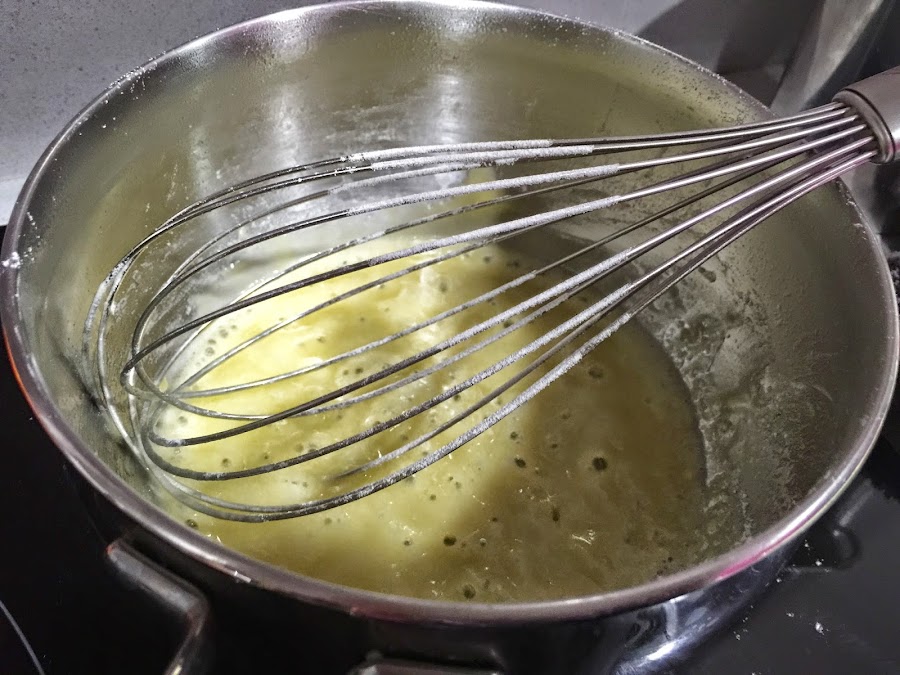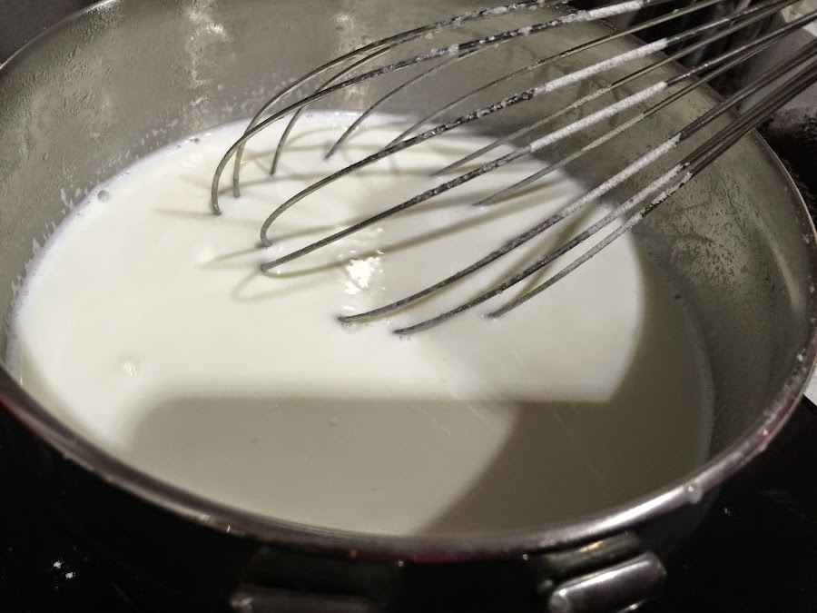 10. Preparamos la bechamel. Ponemos en la sartén la mantequilla a fuego medio-bajo. Añadimos la cucharada colmada de harina y la rehogamos, así evitaremos que nuestra bechamel sepa a harina cruda. Calentamos los 650m de leche y poco a poco la vamos añadiendo. Tenemos que ir removiendo con las varillas para evitar que se formen grumos. Cuando haya tomado la consistencia que nos gusta, añadimos el punto de sal, pimienta negra y la pizca de nuez moscada. Reservamos.