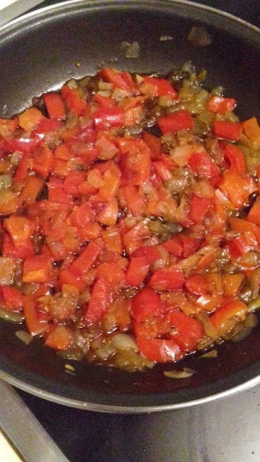 Comenzamos preparando la salsa de nuestro plato. Picamos la cebolla y el pimiento rojo y empezamos a pocharla en una sartén con un poco de aceite de oliva virgen extra. Lo hacemos poco a poco y con una tapadera para que la verdura sude y nos quede bien pochada. Salpimentamos.