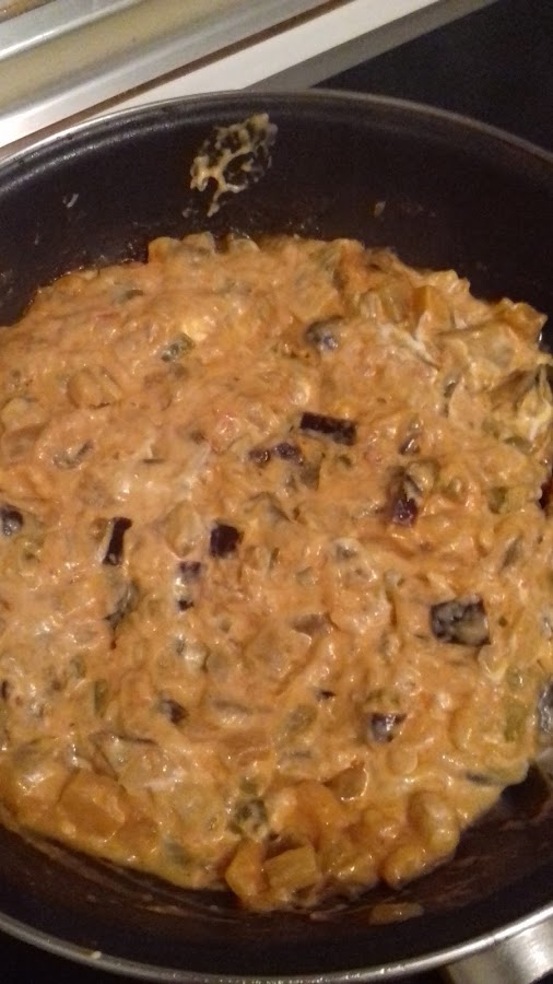 En la misma sartén, no necesitamos ni lavarla, echamos un hilo de aceite y sofreimos el pimiento verde y la berenjena picados a cuadraditos, añadimos ele tomate rallado, salpimentamos y hacemos hasta que esté todo muy pochado al igual que la salsa. Añadimos un par de cucharadas de queso de untar, tipo Philadelphia, integramos bien y reservamos.