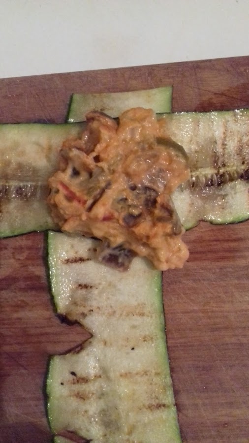 Montamos las lasañas cogiendo dos láminas de calabacín y colocándolas en forma de cruz, en el cruce de ambas le ponemos una porción de masa de berenjena, pimiento y tomate y cerramos haciendo un paquetito.