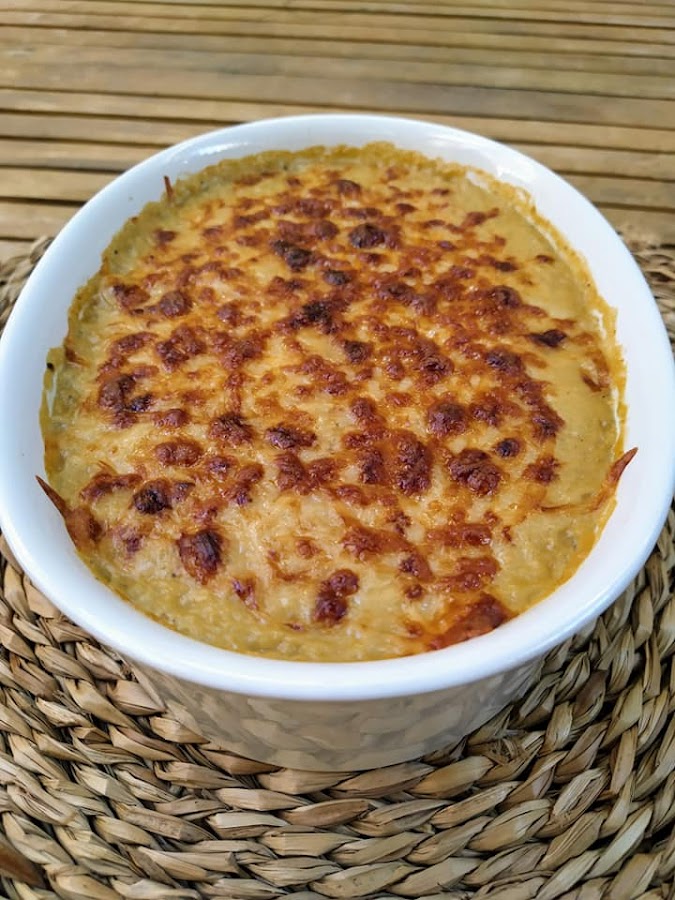 Ponemos por encima queso vegano estilo mozarella de Violife y metemos en el horno con la opción gratinar 10 minutos, hasta que el queso vegano se ponga dorado.