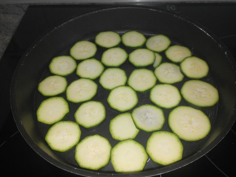 Empezamos cortando el calabacín en rodajitas y lo colocamos en el fondo del recipiente.