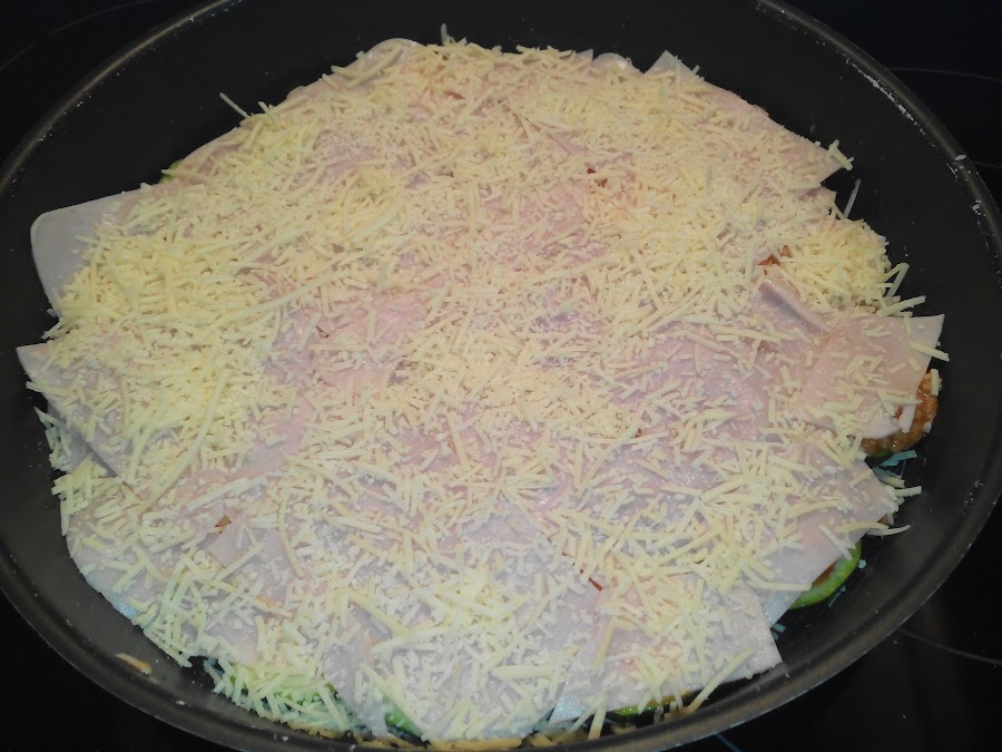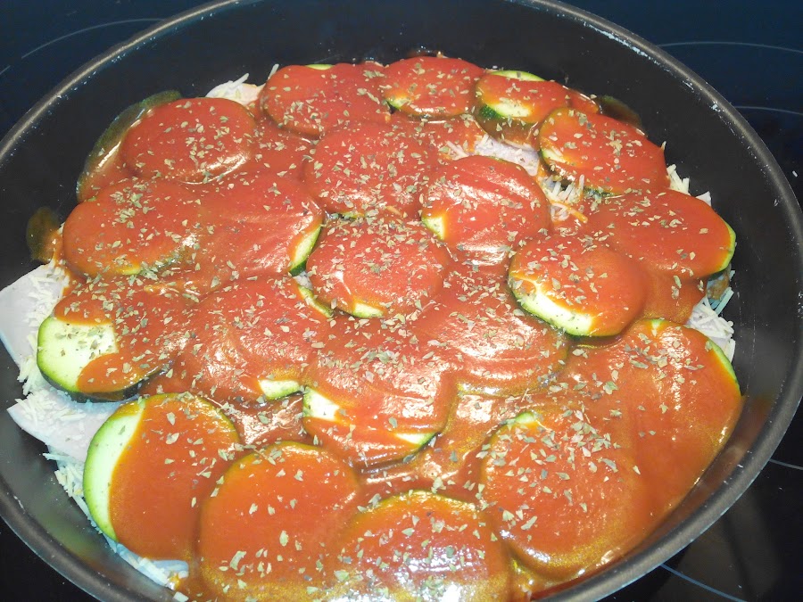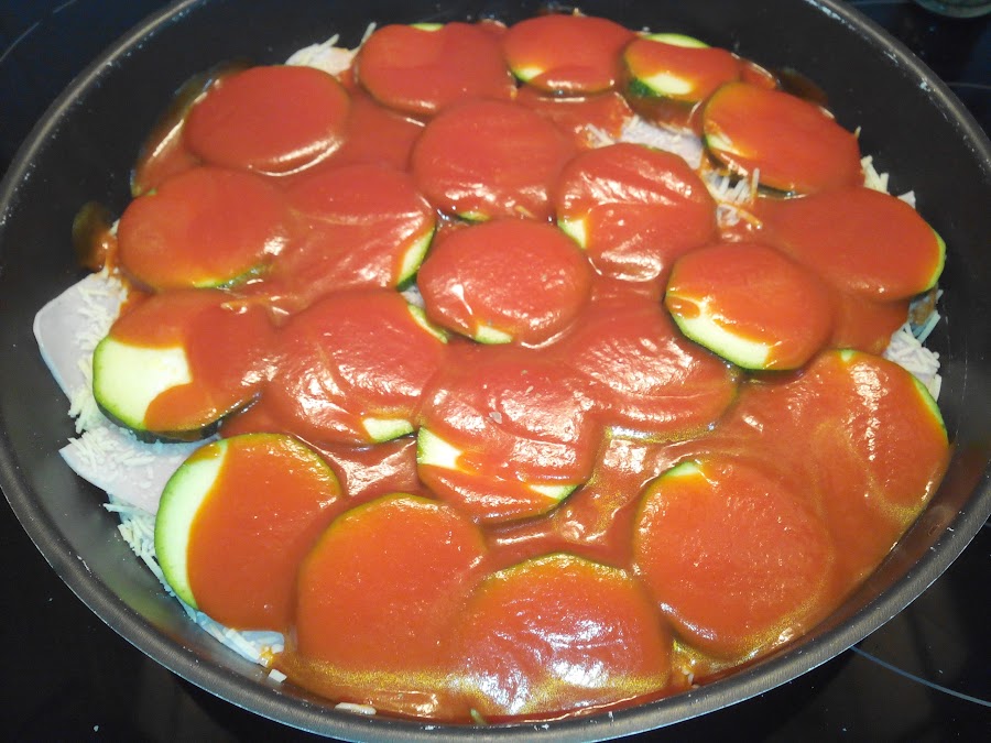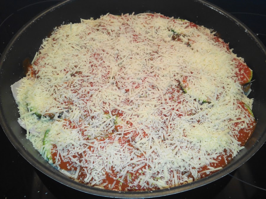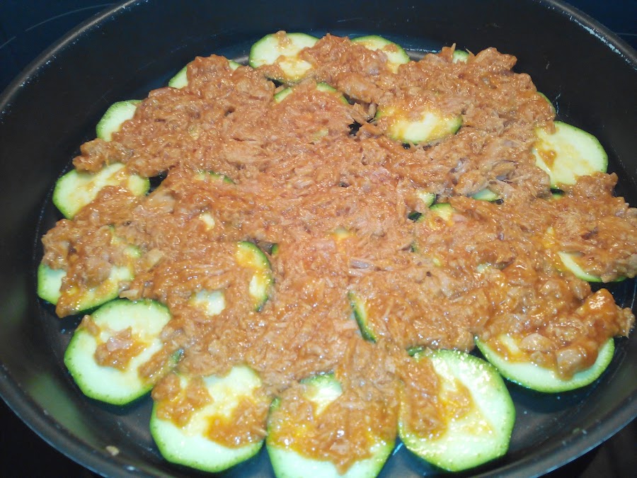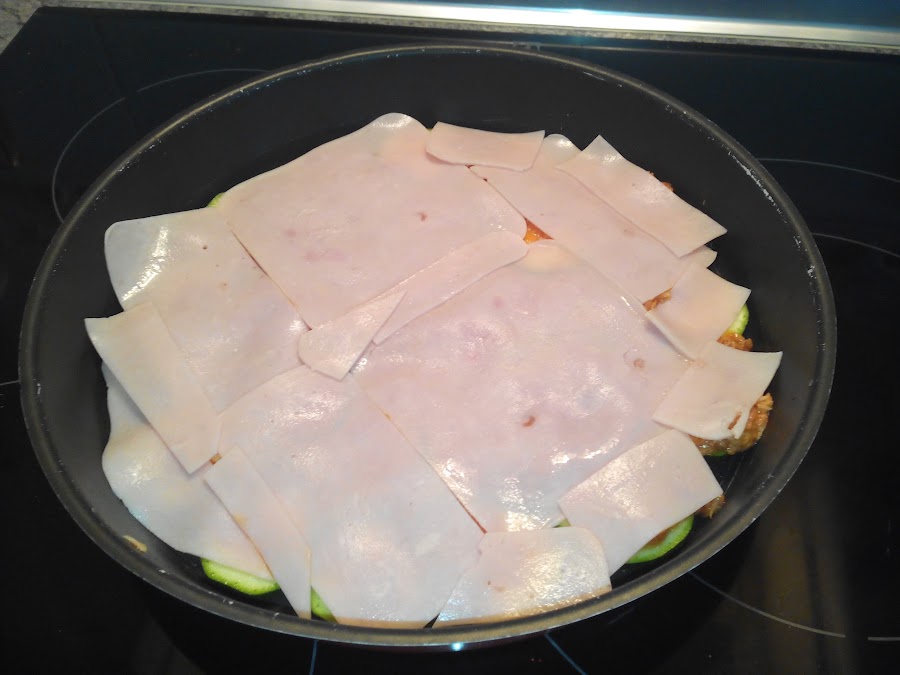 Y echamos esta mezcla encima de la primera capa de calabacines para ir haciendo capas.