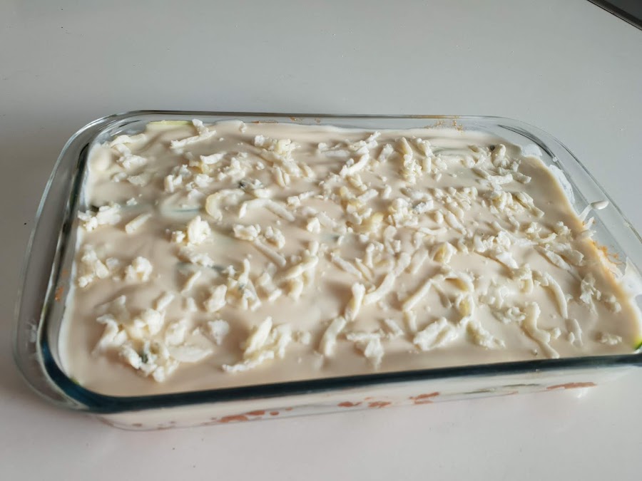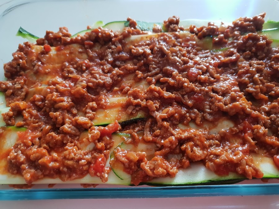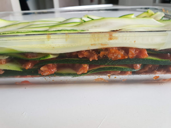 6. - Volvemos a echar boloñesa sobre el calabacín y volvemos a cubrir de nuevo con más calabacín, así hasta finalizar todo el relleno. Terminando con una capa de calabacín por encima.