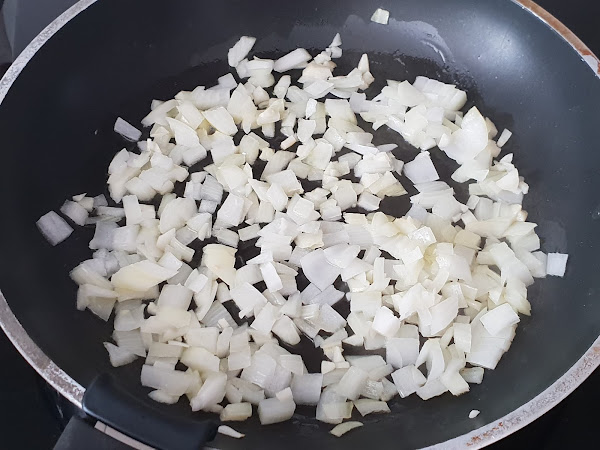 1. - Comenzamos pelando y picando la cebola y el ajo, y lo ponemos a pochar en una sartén, hasta que comience a tomar color.