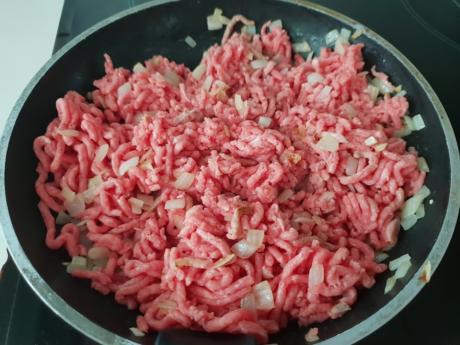 3. - Cuando la cebolla esté. añadimos la carne picada, salpimentamos al gusto y sofreímos, hasta que esté cocinada, unos 8 o 10 minutos.