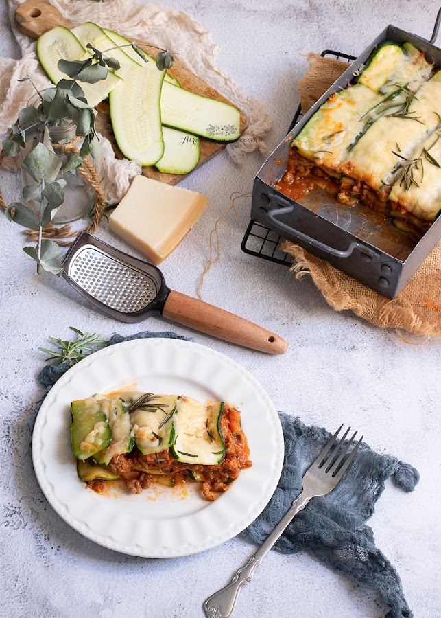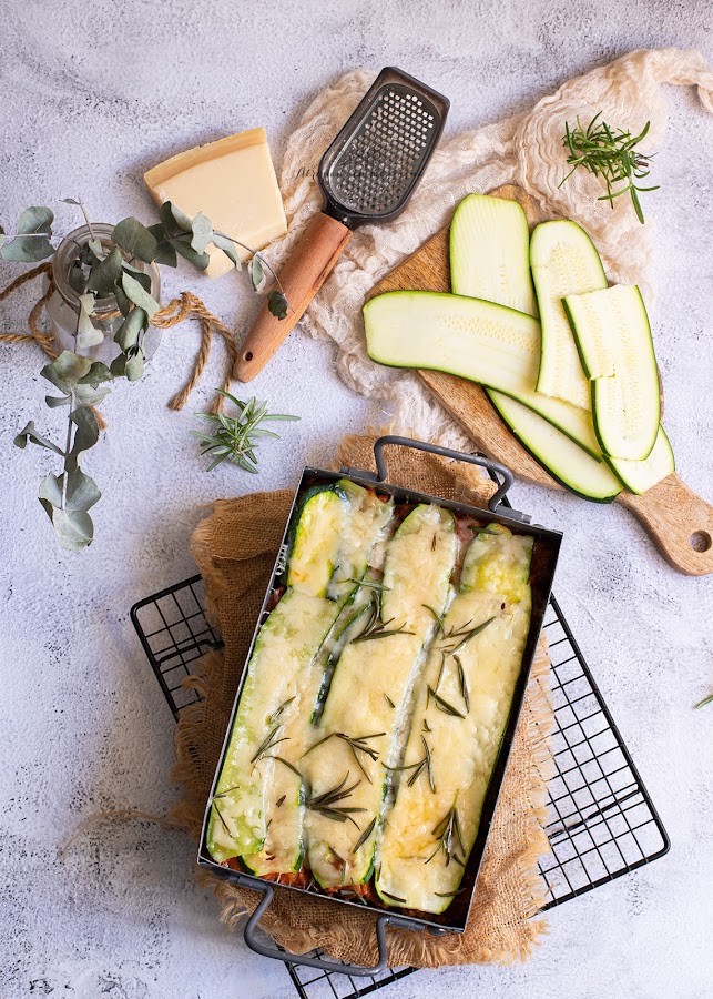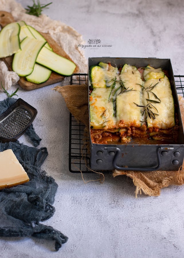 Vamos a empezar la semana con una receta muy rica, lasaña de calabacín, que imita a una falsa lasaña boloñesa, ya que no lleva pasta, en su lugar calabacín, y además tampoco lleva salsa bechamel, por lo que aligera muchísimo las calorías finales del plato. Es una manera ideal de introducir más verduras a nuestros platos, sobre todo cuando a los niños les cuesta tomarlas. La salsa boloñesa que lleva es la que preparo habitualmente en casa y que queda muy rica tanto en platos de pasta como en estos con verduras.
