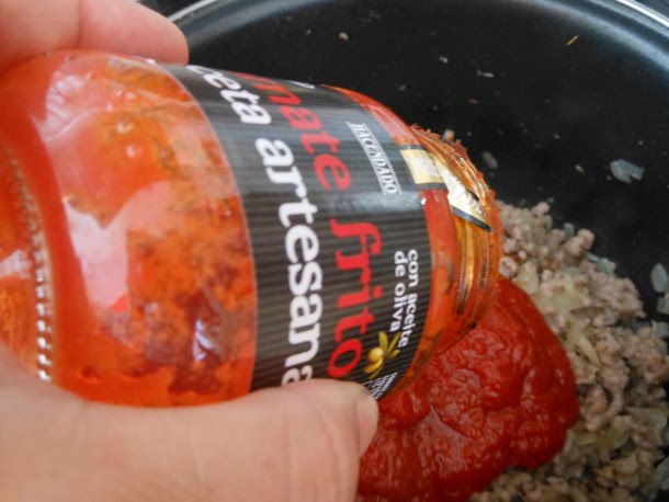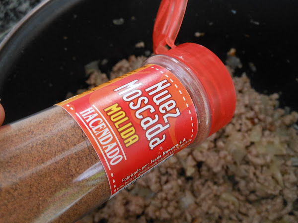 Seguidamente añade el brick de tomate frito, la cucharadita de orégano, la media cucharadita de nuez moscada y la pimienta negra recién molida, yo suelo poner media cucharadita de pimienta negra molida, pero esto va al gusto.