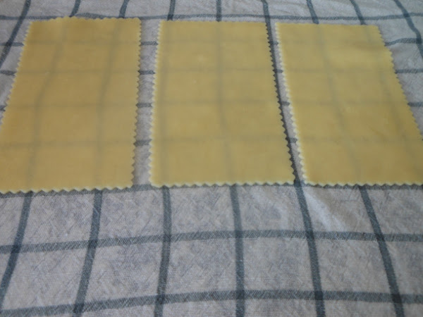 Tras esto coloca tres placas de lasaña superponiendo los bordes de una sobre los bordes de la otra.